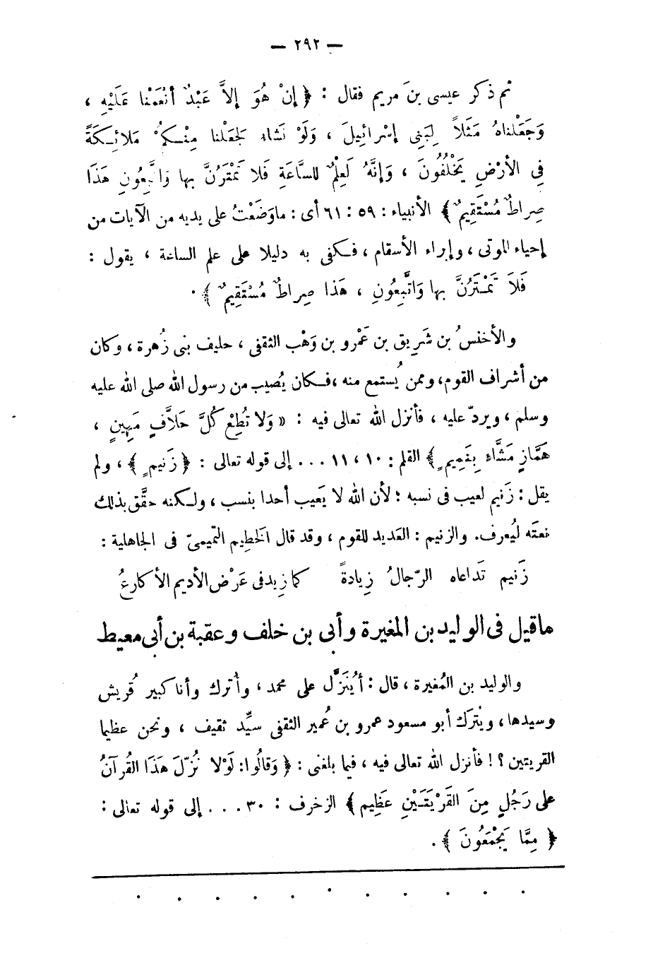 وَالْوَلِيدُ بْنُ الْمُغِيرَةِ، قَالَ: أَيُنَزّلُ عَلَى مُحَمّدٍ، وَأُتْرَكُ وَأَنَا كَبِيرُ قُرَيْشٍ وَسَيّدُهَا، وَيُتْرَكُ أَبُو مَسْعُودٍ عَمْرُو بْنُ عُمَيْرٍ الثّقَفِيّ سَيّدُ ثَقِيفٍ، وَنَحْنُ عَظِيمَا الْقَرْيَتَيْنِ؟! فَأَنْزَلَ اللهُ تَعَالَى فِيهِ، فِيمَا بَلَغَنِي: وَقالُوا: لَوْلا نُزِّلَ هذَا الْقُرْآنُ عَلى رَجُلٍ مِنَ الْقَرْيَتَيْنِ عَظِيمٍ الزخرف: 30 ... إلى قوله تعالى:
