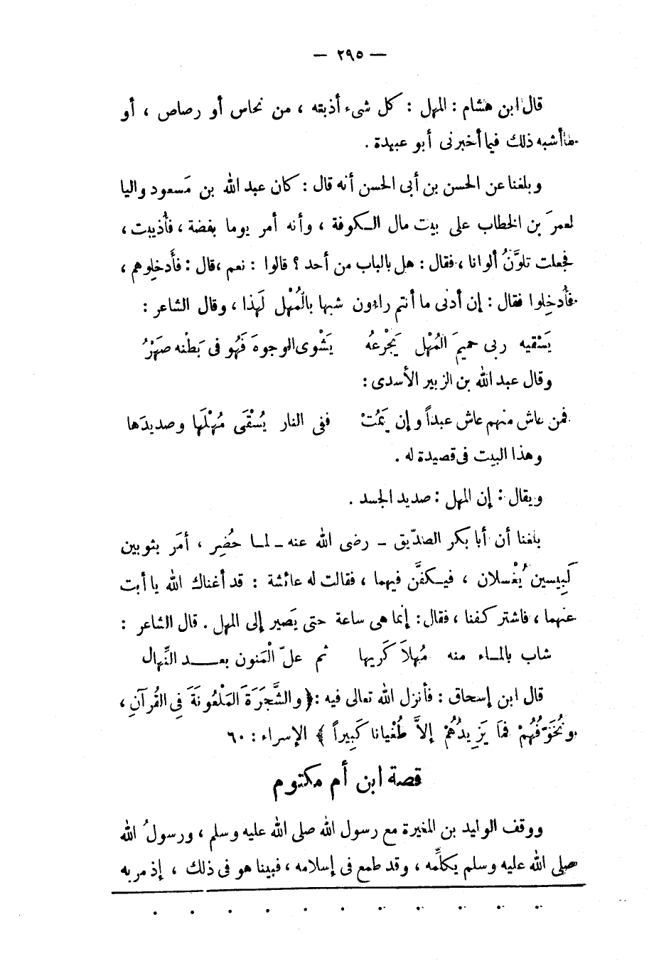 قَالَ ابْنُ هِشَامٍ: الْمُهْلُ: كُلّ شَيْءٍ أَذَبْته، مِنْ نُحَاسٍ أَوْ رَصَاصٍ، أَوْ مَا أَشْبَهَ ذلك فيما أخبرنى أبو عبيدة.