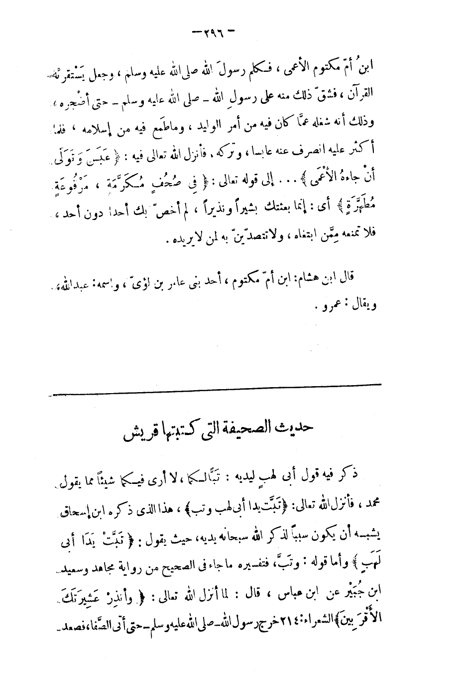 حَدِيثُ الصّحِيفَةِ الّتِي كَتَبَتْهَا قُرَيْشٌ ذَكَرَ فِيهِ قول أبى لهب ليديه: تبّالكما، لَا أَرَى فِيكُمَا شَيْئًا مِمّا يَقُولُ مُحَمّدٌ، فَأَنْزَلَ اللهُ تَعَالَى: تَبَّتْ يَدا أَبِي لَهَبٍ وَتَبَّ، هَذَا الّذِي ذَكَرَهُ ابْنُ إسْحَاقَ يُشْبِهُ أَنْ يَكُونَ سَبَبًا لِذِكْرِ اللهِ سُبْحَانَهُ يَدَيْهِ، حَيْثُ يَقُولُ: تَبَّتْ يَدا أَبِي لَهَبٍ وَأَمّا قوله: وتبّ، فتفسيره مَا جَاءَ فِي الصّحِيحِ مِنْ رِوَايَةِ مُجَاهِدٍ وسعيد ابن جُبَيْرٍ عَنْ ابْنِ عَبّاسٍ، قَالَ: لَمّا أَنَزَلَ اللهُ تَعَالَى: وَأَنْذِرْ عَشِيرَتَكَ الْأَقْرَبِينَ الشّعَرَاءُ: 214 خَرَجَ رَسُولُ اللهِ- صَلّى اللهُ عَلَيْهِ وَسَلّمَ- حتى أَتَى الصّفَا، فَصَعِدَ