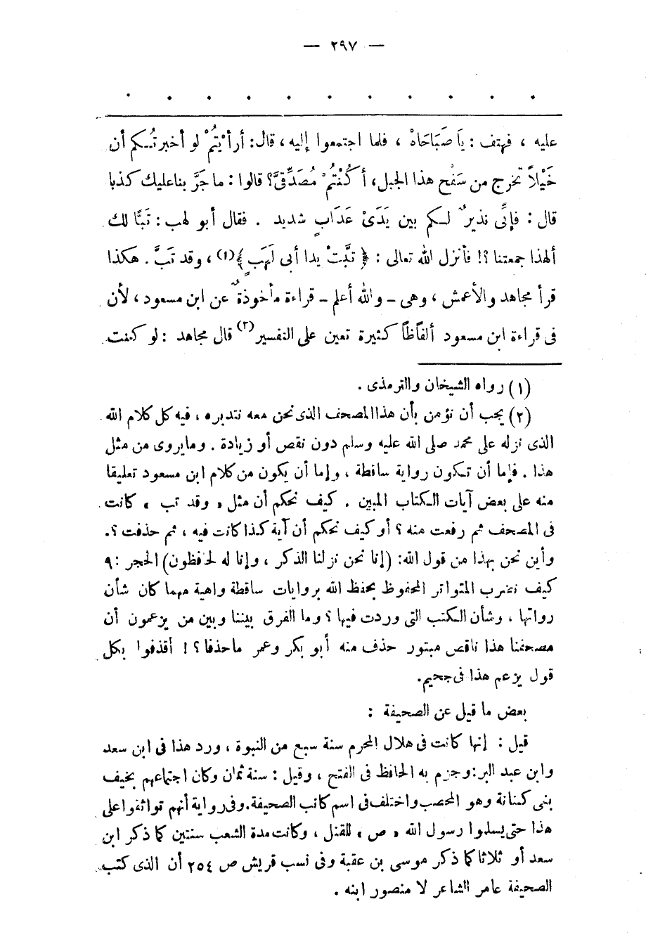 (2) يجب أن نؤمن بأن هذا المصحف الذى نحن معه نتدبره، فيه كل كلام الله الذى نزله على محمد صلّى الله عليه وسلم دون نقص أو زيادة. وما يروى من مثل هذا. فإما أن تكون رواية ساقطة، وإما أن يكون من كلام ابن مسعود تعليقا منه على بعض آيات الكتاب المبين. كيف نحكم أن مثل «وقد تب» كانت فى المصحف ثم رفعت منه؟ أو كيف نحكم أن آية كذا كانت فيه، ثم حذفت؟. وأين نحن بهذا من قول الله: (إنا نحن نزلنا الذكر، وإنا له لحافظون) الحجر: 9 كيف نضرب المتواتر المحفوظ بحفظ الله بروايات ساقطة واهية مهما كان شأن رواتها، وشأن الكتب التى وردت فيها؟ وما الفرق بيننا وبين من يزعمون أن مصحفنا هذا ناقص مبتور حذف منه أبو بكر وعمر ما حذفا؟! اقذفوا بكل قول يزعم هذا فى جحيم. بعض ما قيل عن الصحيفة: قيل: إنها كانت فى هلال المحرم سنة سبع من النبوة، ورد هذا فى ابن سعد وابن عبد البر: وجزم به الحافظ فى الفتح، وقيل: سنة ثمان وكان اجتماعهم بخيف بنى كنانة وهو المحصب واختلف فى اسم كاتب الصحيفة. وفى رواية أنهم تواثقوا على هذا حتى يسلموا رسول الله «ص» للنقل، وكانت مدة الشعب سنتين كما ذكر ابن سعد أو ثلاثا كما ذكر موسى بن عقبة وفى نسب قريش ص 254 أن الذى كتب الصحيفة عامر الشاعر لا منصور ابنه.