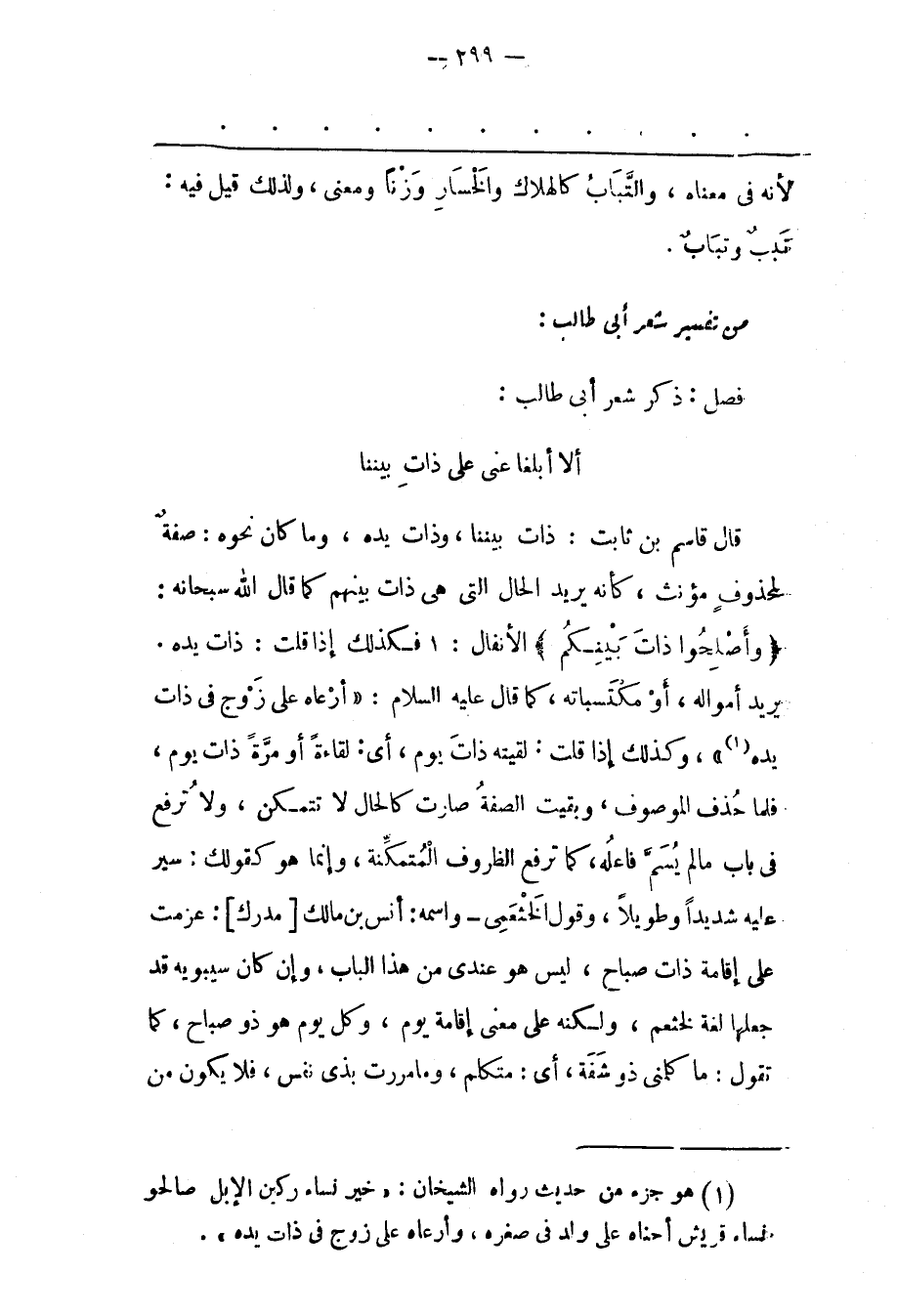 قَالَ قَاسِمُ بْنُ ثَابِتٍ: ذَاتِ بَيْنَنَا، وَذَاتِ يَدِهِ، وَمَا كَانَ نَحْوُهُ: صِفَةٌ لِمَحْذُوفِ مُؤَنّثٌ، كَأَنّهُ يُرِيدُ الْحَالَ الّتِي هِيَ ذَاتُ بَيْنِهِمْ كَمَا قَالَ اللهُ سُبْحَانَهُ:
