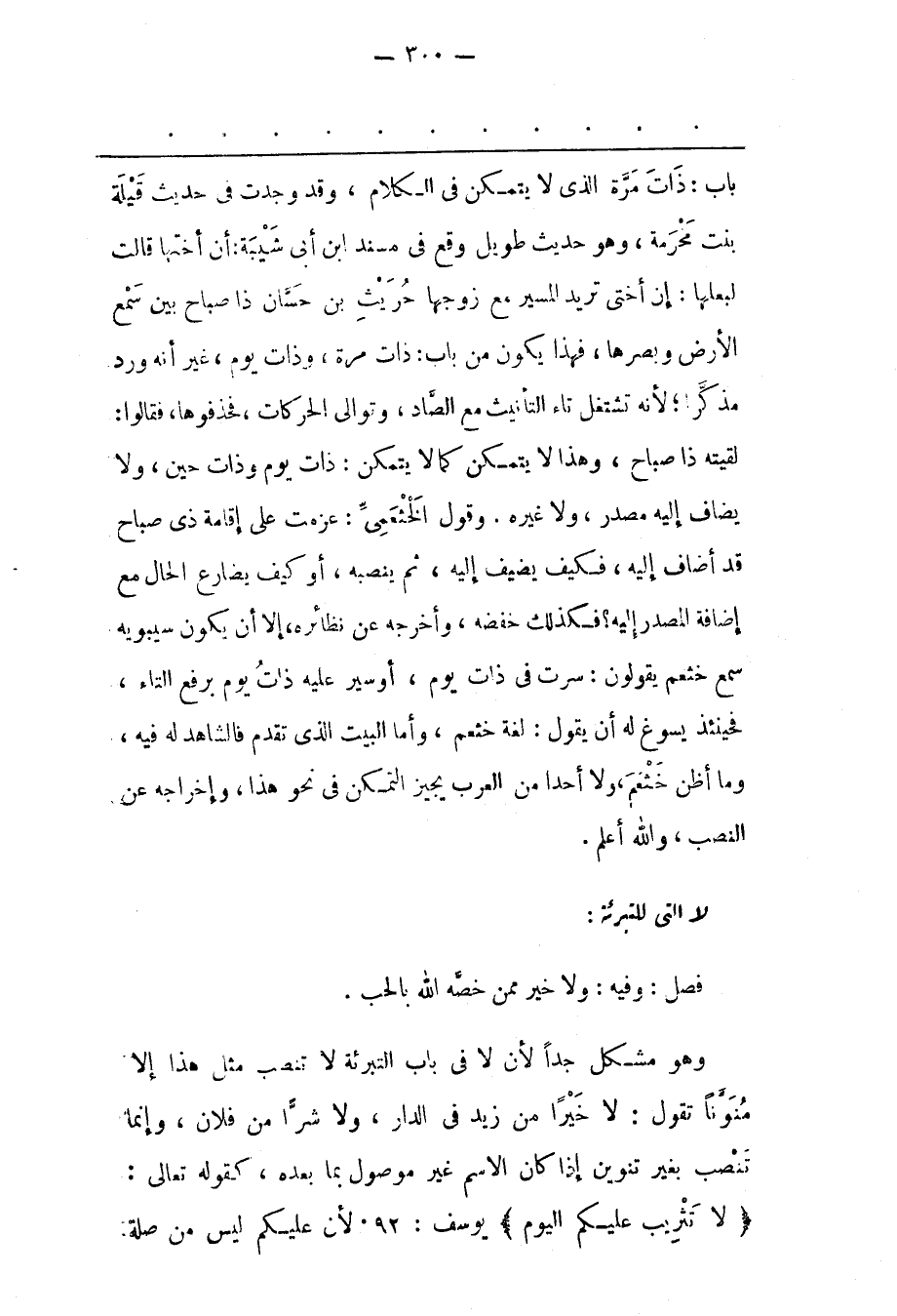 بَابِ: ذَاتِ مَرّةً الّذِي لَا يَتَمَكّنُ فِي الْكَلَامِ، وَقَدْ وَجَدْت فِي حَدِيثِ قَيْلَةَ بِنْتِ محرمة، وَهُوَ حَدِيثٌ طَوِيلٌ وَقَعَ فِي مُسْنَدِ ابْنِ أَبِي شَيْبَةَ: أَنّ أُخْتَهَا قَالَتْ لِبَعْلِهَا: إنّ أُخْتِي تُرِيدُ الْمَسِيرَ مَعَ زَوْجِهَا حُرَيْثِ بْنِ حَسّانَ ذَا صَبَاحٍ بَيْنَ سَمْعِ الْأَرْضِ وَبَصَرِهَا، فَهَذَا يَكُونُ مِنْ بَابِ: ذَاتِ مَرّةٍ، وَذَاتِ يَوْمٍ، غَيْرَ أَنّهُ وَرَدَ مُذَكّرًا؛ لِأَنّهُ تَشْتَغِلُ تَاءُ التّأْنِيثِ مَعَ الصّادِ، وَتَوَالِي الْحَرَكَاتِ، فَحَذَفُوهَا، فَقَالُوا: