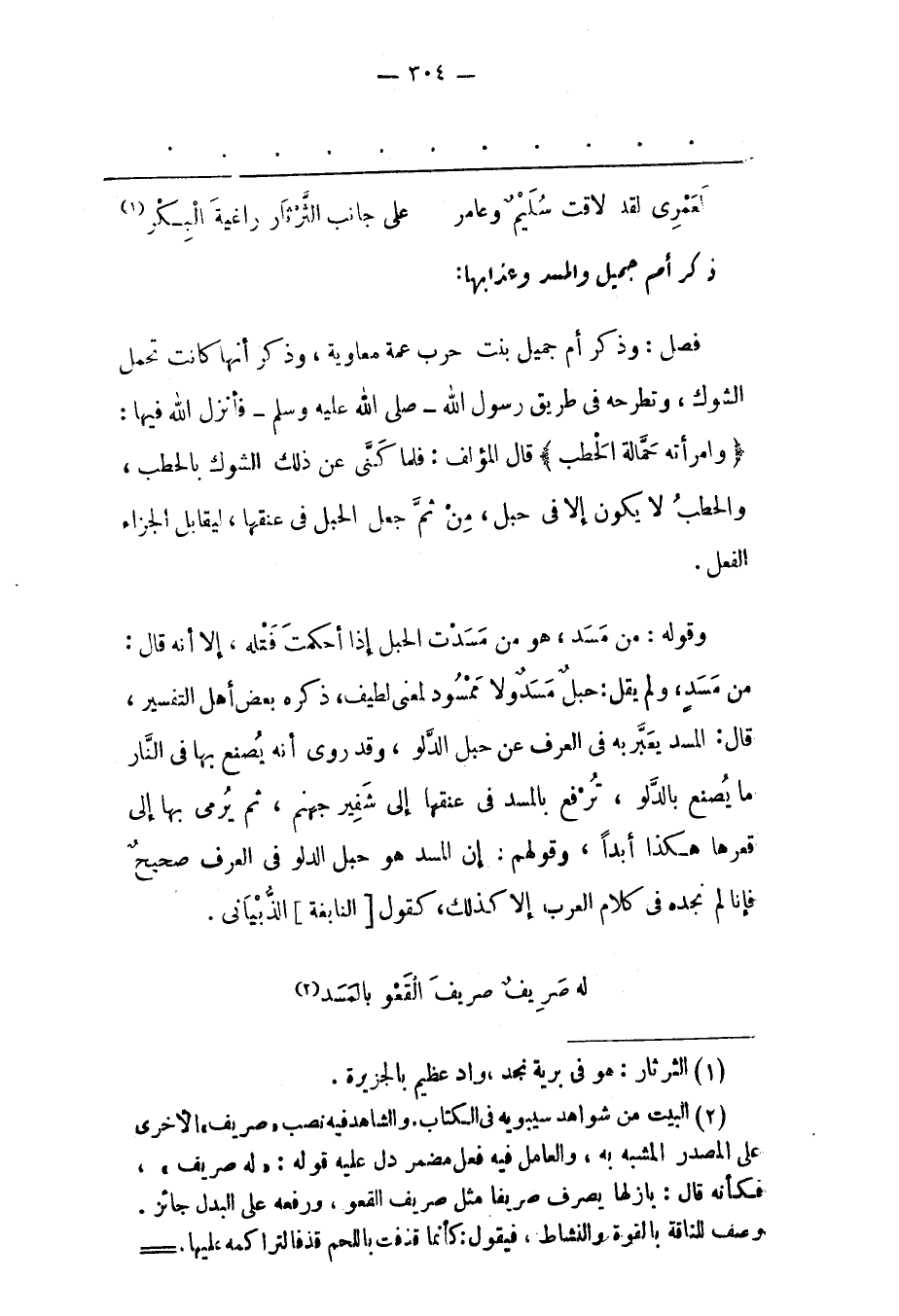 فَصْلٌ: وَذَكَرَ أُمّ جَمِيلٍ بِنْتَ حَرْبٍ عَمّةَ مُعَاوِيَةَ، وَذَكَرَ أَنّهَا كَانَتْ تَحْمِلُ الشّوْكَ، وَتَطْرَحُهُ فِي طَرِيقِ رَسُولِ اللهِ- صَلَّى اللَّهُ عَلَيْهِ وَسَلَّمَ- فَأَنْزَلَ اللهُ فِيهَا: