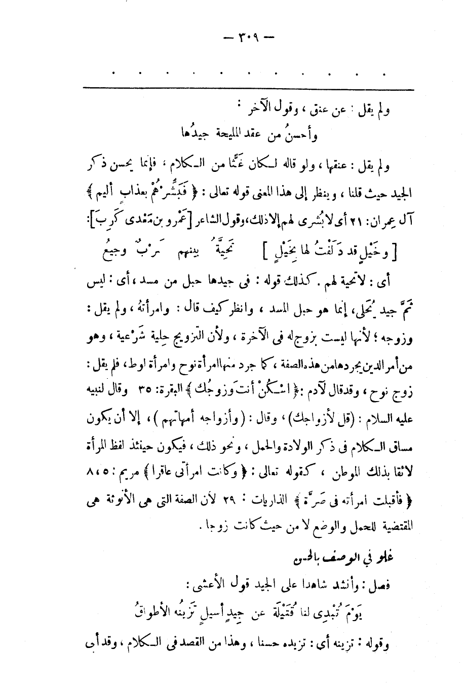 وَلَمْ يقل: عنقها، ولو قاله لَكَانَ غَثّا مِنْ الْكَلَامِ، فَإِنّمَا يَحْسُنُ ذِكْرُ الْجِيدِ حَيْثُ قُلْنَا، وَيَنْظُرُ إلَى هَذَا الْمَعْنَى قَوْلُهُ تَعَالَى: فَبَشِّرْهُمْ بِعَذابٍ أَلِيمٍ آلُ عِمْرَانَ: 21 أَيْ لَا بُشْرَى لَهُمْ إلّا ذَلِكَ، وَقَوْلُ الشّاعِرِ [عَمْرُو بْنُ مَعْدِي كَرِبَ] :