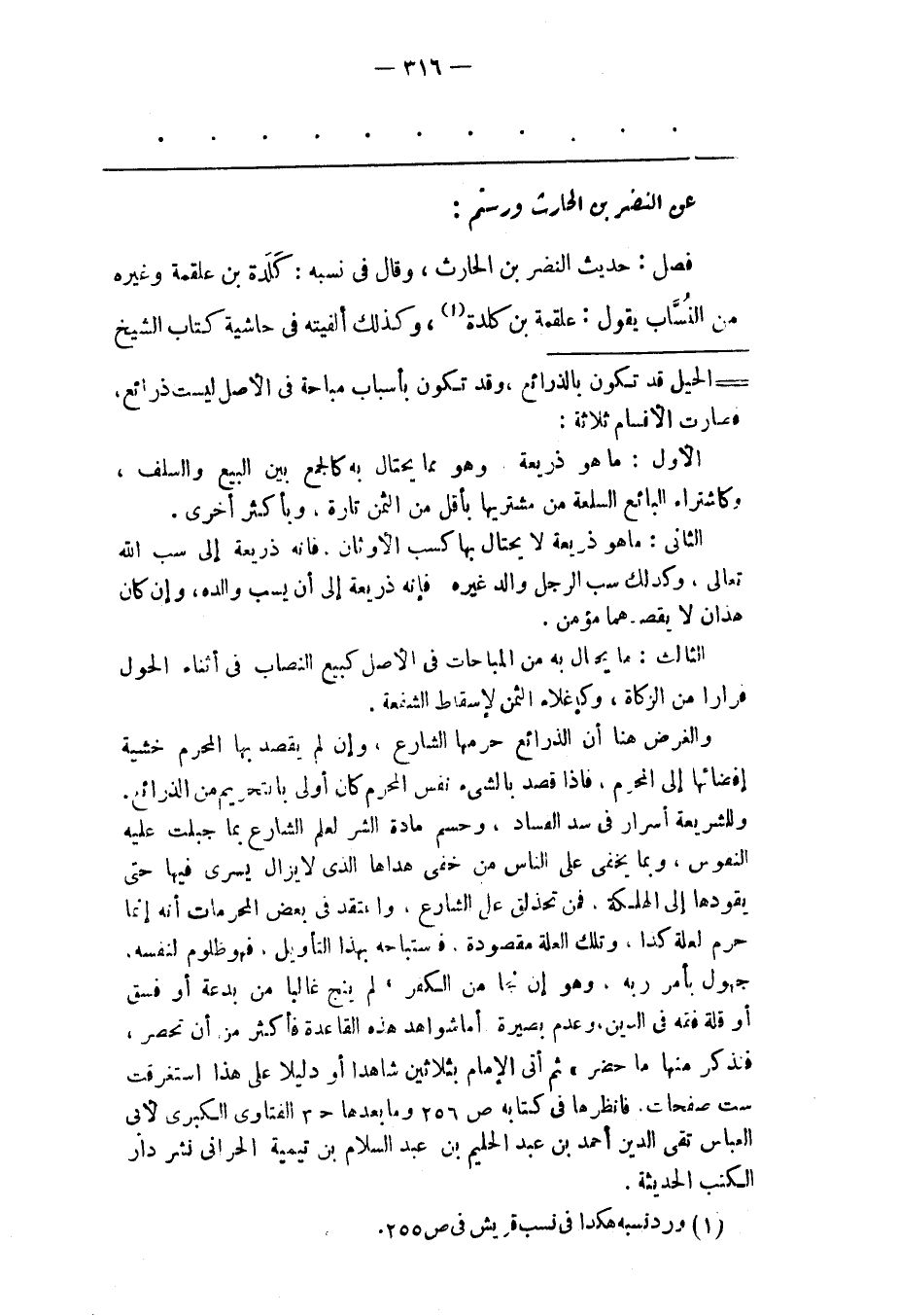 - الحيل قد تكون بالذرائع، وقد تكون بأسباب مباحة فى الأصل ليست ذرائع، فصارت الأقسام ثلاثة: الأول: ما هو ذريعة وهو مما يحتال به كالجمع بين البيع والسلف، وكاشتراء البائع السلعة من مشتريها بأقل من الثمن تارة، وبأكثر أخرى. الثانى: ما هو ذريعة لا يحتال بها كسب الأوثان. فانه ذريعة إلى سب الله تعالى، وكذلك سب الرجل والد غيره فإنه ذريعة إلى أن يسب والده، وإن كان هذان لا يقصدهما مؤمن. الثالث: ما يحال به من المباحات فى الأصل كبيع النصاب فى أثناء الحول فرارا من الزكاة، وكإغلاء الثمن لإسقاط الشفعة. والغرض هنا أن الذرائع حرمها الشارع، وإن لم يقصد بها المحرم خشية إفضائها إلى المحرم، فاذا قصد بالشىء نفس المحرم كان أولى بالتحريم من الذرائع. وللشريعة أسرار فى سد الفساد، وجسم مادة الشر لعلم الشارع بما جبلت عليه النفوس، وبما يخفى على الناس من خفى هداها الذى لا يزال يسرى فيها حتى يقودها إلى الهلكة. فمن تحذلق على الشارع، واعتقد فى بعض المحرمات أنه إنما حرم لعلة كذا، وتلك العلة مقصودة. فاستباحه بهذا التأويل. فهو ظلوم لنفسه، جهول بأمر ربه، وهو إن نجا من الكفر، لم ينج غالبا من بدعة أو فسق أو قلة فقيه فى الدين، وعدم بصيرة أما شواهد هذه القاعدة فأكثر من أن تحصر، فنذكر منها ما حضر» ثم أتى الإمام بثلاثين شاهدا أو دليلا على هذا استغرقت ست صفحات. فانظرها فى كتابه ص 256 وما بعدها. ح 3 الفتاوى الكبرى لأبى العباس تقى الدين أحمد بن عبد الحليم بن عبد السلام بن تيمية الحرانى نشر دار الكتب الحديثة.