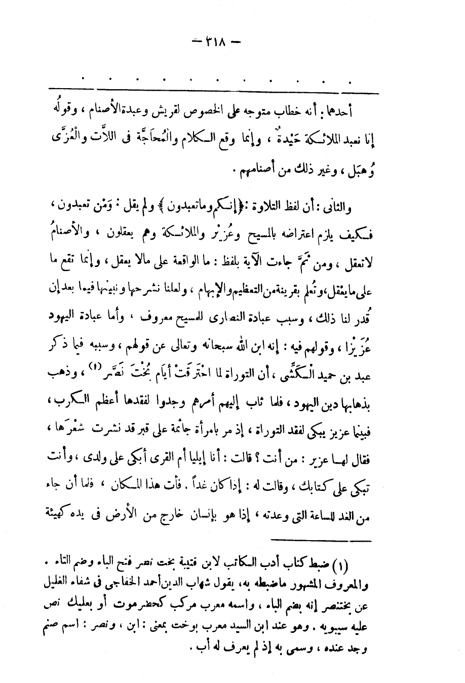 وَالثّانِي: أَنّ لفظ التلاوة: إِنَّكُمْ وَما تَعْبُدُونَ وَلَمْ يَقُلْ: وَمَنْ تَعْبُدُونَ، فَكَيْفَ يَلْزَمُ اعْتِرَاضُهُ بِالْمَسِيحِ وَعُزَيْرٍ وَالْمَلَائِكَةِ وَهُمْ يَعْقِلُونَ، وَالْأَصْنَامُ لَا تَعْقِلُ، وَمِنْ ثُمّ جَاءَتْ الْآيَةُ بِلَفْظِ: مَا الْوَاقِعَةِ عَلَى مَا لَا يَعْقِلُ، وَإِنّمَا تَقَعُ مَا عَلَى مَا يَعْقِلُ، وَتُعْلَمُ بِقَرِينَةِ مِنْ التّعْظِيمِ وَالْإِبْهَامِ، وَلَعَلّنَا نَشْرَحُهَا وَنُبَيّنُهَا فِيمَا بَعْدُ إنّ قُدّرَ لَنَا ذَلِكَ، وَسَبَبُ عِبَادَةِ النّصَارَى للمسيح معروف، وأما عبادة اليهود عزيزا، وَقَوْلُهُمْ فِيهِ: إنّهُ ابْنُ اللهِ سُبْحَانَهُ وَتَعَالَى عَنْ قَوْلِهِمْ، وَسَبَبُهُ فِيمَا ذَكَرَ عَبْدُ بْنُ حُمَيْدٍ الْكَشّيّ، أَنّ التّوْرَاةَ لَمّا احْتَرَقَتْ أَيّامَ بُخْتَ نَصّرَ «1» ، وَذَهَبَ بِذَهَابِهَا دِينُ الْيَهُودِ، فَلَمّا ثَابَ إلَيْهِمْ أَمْرُهُمْ وَجُدُوا لِفَقْدِهَا أَعْظَمَ الْكَرْبِ، فبينما عزيز يَبْكِي لِفَقْدِ التّوْرَاةِ، إذْ مَرّ بِامْرَأَةِ جَاثِمَةٍ عَلَى قَبْرٍ قَدْ نَشَرَتْ شَعْرَهَا، فَقَالَ لَهَا عُزَيْرٌ: مَنْ أَنْتِ؟ قَالَتْ: أَنَا إيلْيَا أُمّ الْقُرَى أَبْكِي عَلَى وَلَدِي، وَأَنْتَ تَبْكِي عَلَى كِتَابِك، وَقَالَتْ لَهُ: إذَا كَانَ غَدًا، فَأْتِ هَذَا الْمَكَانَ، فَلَمّا أَنْ جَاءَ مِنْ الْغَدِ لِلسّاعَةِ الّتِي وَعَدَتْهُ، إذَا هُوَ بِإِنْسَانِ خَارِجٍ من الأرض فى يده كهيئة