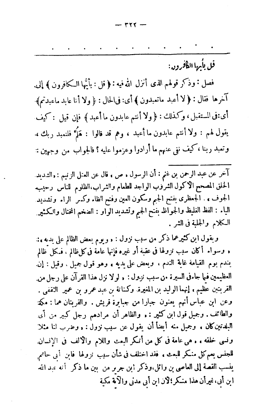 فَصْلٌ: وَذَكَرَ قَوْلَهُمْ الّذِي أَنَزَلَ اللهُ فِيهِ: قُلْ: يَا أَيُّهَا الْكافِرُونَ إلَى آخِرِهَا فَقَالَ: لَا أَعْبُدُ مَا تَعْبُدُونَ أَيْ: فِي الْحَالِ: وَلا أَنا عابِدٌ مَا عَبَدْتُّمْ أَيْ: فِي الْمُسْتَقْبَلِ، وَكَذَلِكَ: وَلا أَنْتُمْ عابِدُونَ ما أَعْبُدُ فَإِنْ قِيلَ: كَيْفَ يَقُولُ لَهُمْ: وَلَا أَنْتُمْ عَابِدُونَ مَا أَعْبُدُ، وَهُمْ قَدْ قَالُوا: هَلُمّ فَلْنَعْبُدْ رَبّك، وَتَعْبُدُ رَبّنَا، كَيْفَ نَفَى عَنْهُمْ مَا أَرَادُوا وَعَزَمُوا عَلَيْهِ؟ فَالْجَوَابُ مِنْ وَجْهَيْنِ: