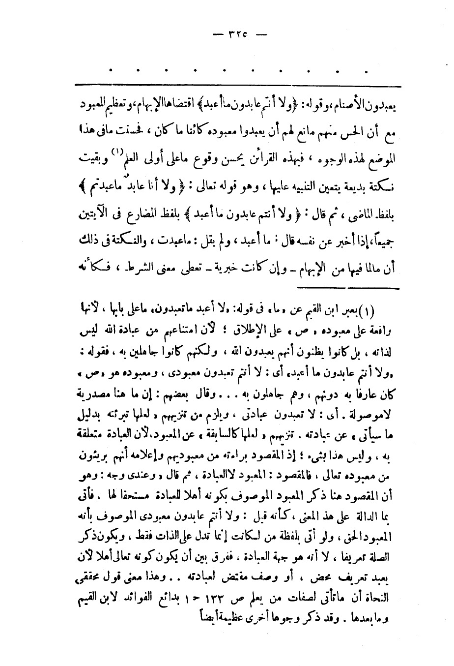 (1) يعبر ابن القيم عن «ما» فى قوله: «لا أعبد ما تعبدون، ما على بابها، لأنها رافعة على معبوده «ص» على الإطلاق؛ لأن امتناعهم من عبادة الله ليس لذاته، بل كانوا يظنون أنهم يعبدون الله، ولكنهم كانوا جاهلين به، فقوله: «ولا أنتم عابدون ما أعبد» أى: لا أنتم تعبدون معبودى، ومعبوده هو «ص» كان عارفا به دونهم، وهم جاهلون به ... وقال بعضهم: إن ما هنا مصدرية لا موصولة. أى: لا تعبدون عبادتى، ويلزم من تنزيههم «لعلها تبرئته بدليل ما سيأتى» عن عبادته. تنزيههم «لعلها كالسابقة» عن المعبود، لأن العبادة متعلقة به، وليس هذا بشىء؛ إذ المقصود براءته من معبوديهم وإعلامه أنهم بريئون من معبوده تعالى، فالمقصود: المعبود لا العبادة، ثم قال «وعندى وجه: وهو أن المقصود هنا ذكر المعبود الموصوف بكونه أهلا للعبادة مستحقا لها، فأتى بما الدالة على هذا المعنى، كأنه قيل: ولا أنتم عابدون معبودى الموصوف بأنه المعبود الحق، ولو أتى بلفظة من لكانت إنما تدل على الذات فقط، ويكون ذكر الصلة تعريفا، لا أنه هو جهة العبادة، ففرق بين أن يكون كونه تعالى أهلا لأن يعبد تعريف محض، أو وصف مقتض لعبادته.. وهذا معنى قول محققى النحاة أن ما تأتى لصفات من يعلم ص 133 ح 1 بدائع الفوائد لابن القيم وما بعدها. وقد ذكر وجوها أخرى عظيمة أيضا