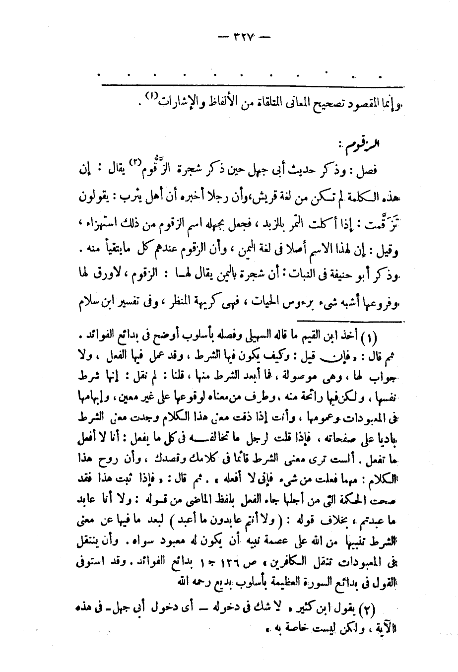 فَصْلٌ: وَذَكَرَ حَدِيثَ أَبِي جَهْلٍ حِينَ ذَكَرَ شَجَرَةَ الزّقّومِ «2» يُقَالُ: إنّ هَذِهِ الْكَلِمَةَ لَمْ تَكُنْ مِنْ لُغَةِ قُرَيْشٍ، وَأَنّ رَجُلًا أَخْبَرَهُ أَنّ أَهْلَ يَثْرِبَ: يَقُولُونَ تَزَقّمْتُ: إذَا أَكَلْت التّمْرَ بِالزّبْدِ، فَجَعَلَ بِجَهْلِهِ اسْمَ الزقوم من ذلك استهزاء، وقيل: إن لهذا الِاسْمَ أَصْلًا فِي لُغَةِ الْيَمَنِ، وَأَنّ الزّقّومَ عِنْدَهُمْ كُلّ مَا يُتَقَيّأُ مِنْهُ.