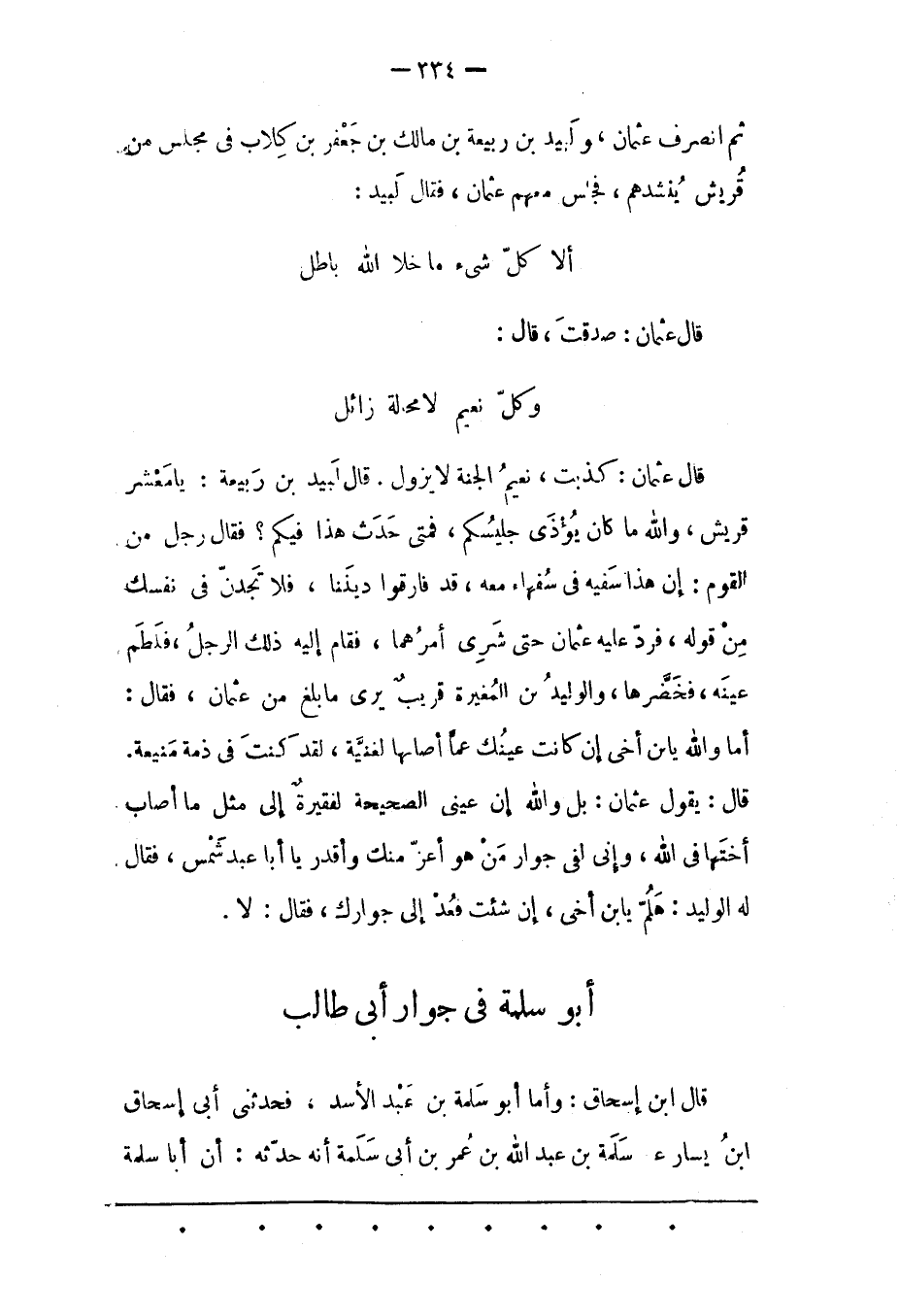 ثُمّ انْصَرَفَ عُثْمَانُ، وَلَبِيدُ بْنُ رَبِيعَةَ بْنِ مَالِكِ بْنِ جَعْفَرِ بْنِ كِلَابٍ فِي مَجْلِسٍ من قريش يشدهم، فَجَلَسَ مَعَهُمْ عُثْمَانُ، فَقَالَ لَبِيدٍ: