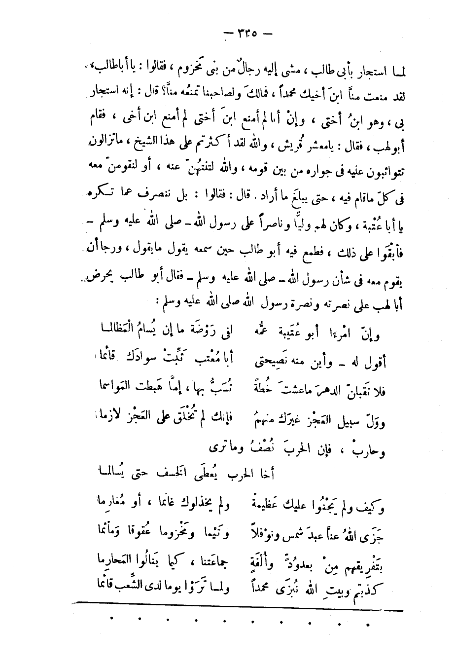 لَمّا اسْتَجَارَ بِأَبِي طَالِبٍ، مَشَى إلَيْهِ رِجَالٌ من بنى مخزوم، فقالوا: يَا أَبَا طَالِبٍ، لَقَدْ مَنَعْت مِنّا ابْنَ أَخِيك مُحَمّدًا، فَمَا لَكَ وَلِصَاحِبِنَا تَمْنَعُهُ مِنّا؟ قَالَ: إنّهُ اسْتَجَارَ بِي، وَهُوَ ابْنُ أُخْتِي، وَإِنْ أَنَا لَمْ أَمْنَعْ ابْنَ أُخْتِي لَمْ أَمْنَعْ ابْنَ أَخِي، فَقَامَ أَبُو لَهَبٍ، فَقَالَ: يَا مَعْشَرَ قُرَيْشٍ، وَاَللهِ لَقَدْ أَكْثَرْتُمْ عَلَى هذا الشيخ، ما تزالون تتوائبون عَلَيْهِ فِي جِوَارِهِ مِنْ بَيْنِ قَوْمِهِ، وَاَللهِ لَتَنْتَهُنّ عَنْهُ، أَوْ لَنَقُومَنّ مَعَهُ فِي كُلّ مَا قَامَ فِيهِ، حَتّى يَبْلُغَ مَا أَرَادَ. قَالَ: فَقَالُوا: بَلْ نَنْصَرِفُ عَمّا تَكْرَهُ يَا أَبَا عُتْبَةَ، وَكَانَ لَهُمْ وَلِيّا وَنَاصِرًا عَلَى رَسُولِ اللهِ- صَلَّى اللَّهُ عَلَيْهِ وَسَلَّمَ- فَأَبْقَوْا عَلَى ذَلِكَ، فَطَمِعَ فِيهِ أَبُو طَالِبٍ حَيْنَ سَمِعَهُ يَقُولُ مَا يَقُولُ، وَرَجَا أَنْ يَقُومَ مَعَهُ فِي شَأْنِ رَسُولِ اللهِ- صَلّى اللهُ عَلَيْهِ وَسَلّمَ- فَقَالَ أَبُو طَالِبٍ يُحَرّضُ أَبَا لَهَبٍ عَلَى نُصْرَتِهِ وَنُصْرَةِ رَسُولَ اللهِ صَلَّى اللَّهُ عَلَيْهِ وَسَلَّمَ: