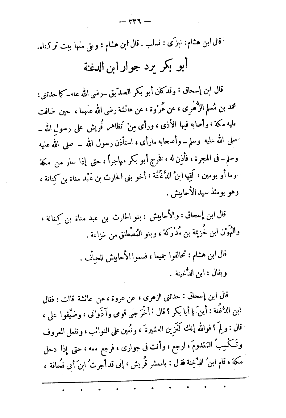 قَالَ ابْنُ إسْحَاقَ: حدثنى الزهرى، عن عروة، عن عائشة قَالَتْ: فَقَالَ ابْنُ الدّغُنّةِ: أَيْنَ يَا أَبَا بَكْرٍ؟ قَالَ: أَخْرَجَنِي قَوْمِي وَآذَوْنِي، وَضَيّقُوا عَلَيّ، قال: ولم؟ فو الله إنّك لَتَزِينُ الْعَشِيرَةَ، وَتُعِينُ عَلَى النّوَائِبِ، وَتَفْعَلُ المعروف وتكسب المعدوم، ارجع، وأنت فِي جِوَارِي، فَرَجَعَ مَعَهُ، حَتّى إذَا دَخَلَ مَكّةَ، قَامَ ابْنُ الدّغُنّةِ فَقَالَ: يَا مَعْشَرَ قُرَيْشٍ، إنّي قَدْ أَجَرْت ابْنَ أَبِي قُحَافَةَ،