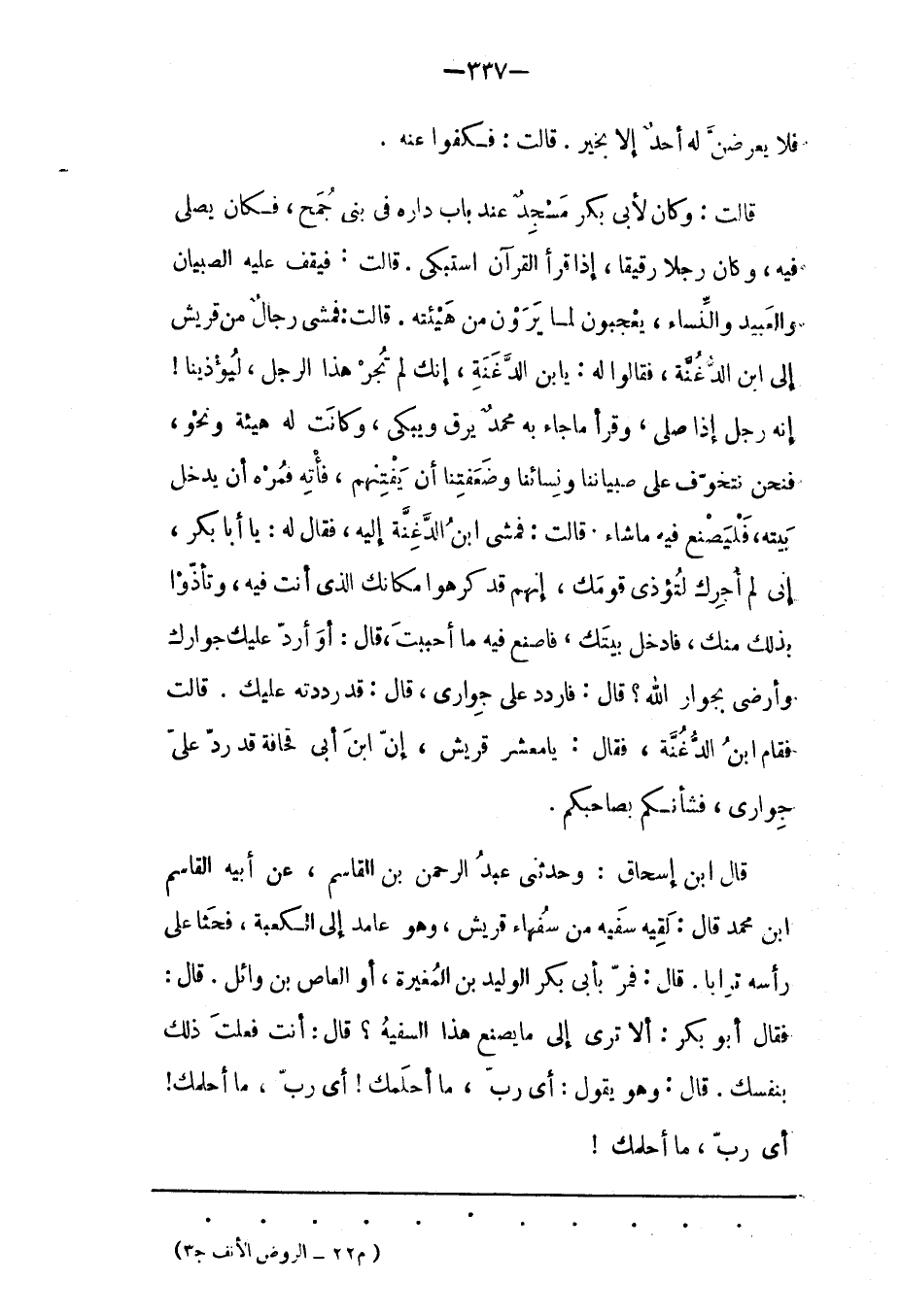 قَالَتْ: وَكَانَ لِأَبِي بَكْرٍ مَسْجِدٌ عِنْدَ بَابِ دَارِهِ فِي بَنِي جُمَحٍ، فَكَانَ يُصَلّي فِيهِ، وَكَانَ رَجُلًا رَقِيقًا، إذَا قَرَأَ الْقُرْآنَ اسْتَبْكَى. قَالَتْ: فَيَقِفُ عَلَيْهِ الصّبْيَانُ وَالْعَبِيدُ وَالنّسَاءُ، يَعْجَبُونَ لِمَا يَرَوْنَ مِنْ هَيْئَتِهِ. قَالَتْ: فَمَشَى رِجَالٌ مِنْ قُرَيْشٍ إلَى ابْنِ الدّغُنّةِ، فَقَالُوا لَهُ: يا بن الدّغُنّةِ، إنّك لَمْ تُجِرْ هَذَا الرّجُلَ، لِيُؤْذِيَنَا! إنّهُ رَجُلٌ إذَا صَلّى، وَقَرَأَ مَا جَاءَ بَهْ مُحَمّدٌ يَرِقّ وَيَبْكِي، وَكَانَتْ لَهُ هَيْئَةٌ وَنَحْوٌ، فَنَحْنُ نَتَخَوّفُ عَلَى صِبْيَانِنَا وَنِسَائِنَا وَضَعَفَتِنَا أَنْ يَفْتِنَهُمْ، فَأْتِهِ فَمُرْهُ أَنْ يَدْخُلَ بَيْتَهُ، فَلْيَصْنَعْ فِيهِ مَا شَاءَ: قَالَتْ: فَمَشَى ابْنُ الدّغُنّةِ إلَيْهِ، فَقَالَ لَهُ: يَا أَبَا بَكْر، إنى لم أجرك لتؤذى قومك، إنهم قد كرهوا مَكَانَك الّذِي أَنْتَ فِيهِ، وَتَأَذّوْا بِذَلِكَ مِنْك، فَادْخُلْ بَيْتَك، فَاصْنَعْ فِيهِ مَا أَحْبَبْتَ، قَالَ: أو أردّ عَلَيْك جِوَارَك وَأَرْضَى بِجِوَارِ اللهِ؟ قَالَ: فَارْدُدْ عَلَيّ جِوَارِي، قَالَ: قَدْ رَدَدْتُهُ عَلَيْك. قَالَتْ فَقَامَ ابْنُ الدّغُنّةِ، فَقَالَ: يَا مَعْشَرَ قُرَيْشٍ، إنّ ابْنَ أَبِي قُحَافَةَ قَدْ رَدّ عَلَيّ جِوَارِي، فَشَأْنُكُمْ بِصَاحِبِكُمْ.