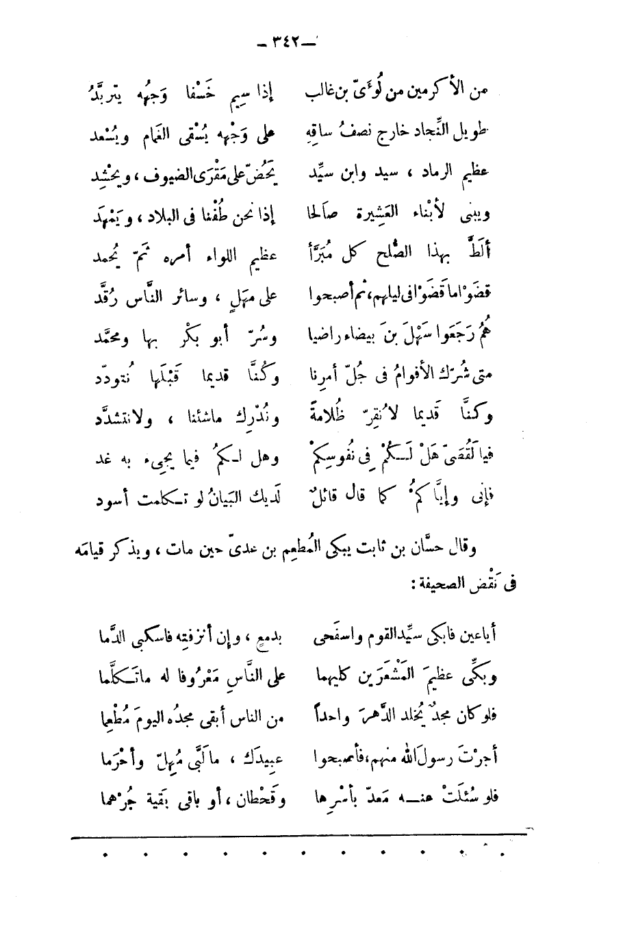 وَقَالَ حَسّانُ بْنُ ثَابِتٍ يَبْكِي الْمُطْعِمَ بْنَ عَدِيّ حِينَ مَاتَ، وَيَذْكُرُ قِيَامَهُ فِي نَقْضِ الصّحِيفَةِ: