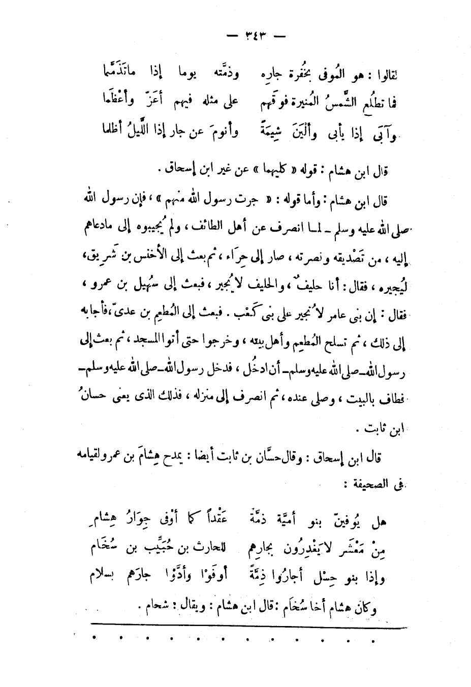 قال ابن هشام: وأما قوله: «جرت رَسُولَ اللهِ مِنْهُمْ» ، فَإِنّ رَسُولَ اللهِ صَلَّى اللَّهُ عَلَيْهِ وَسَلَّمَ- لَمّا انْصَرَفَ عَنْ أَهْلِ الطّائِفِ، وَلَمْ يُجِيبُوهُ إلَى مَا دَعَاهُمْ إلَيْهِ، مِنْ تَصْدِيقِهِ وَنُصْرَتِهِ، صَارَ إلَى حِرَاءٍ، ثُمّ بَعَثَ إلَى الْأَخْنَسِ بْن شَرِيقٍ، لِيُجِيرَهُ، فَقَالَ: أَنَا حَلِيفٌ، وَالْحَلِيفُ لَا يُجِيرُ، فَبَعَثَ إلَى سُهَيْلِ بْنِ عَمْرٍو، فَقَالَ: إنّ بَنِي عَامِر لَا تُجِيرُ عَلَى بَنِي كَعْبٍ. فَبَعَثَ إلَى الْمُطْعِمِ بْنِ عَدِيّ، فَأَجَابَهُ إلَى ذَلِكَ، ثُمّ تَسَلّحَ الْمُطْعِمُ وَأَهْلُ بَيْتِهِ، وَخَرَجُوا حَتّى أَتَوْا الْمَسْجِدَ، ثُمّ بَعَثَ إلَى رَسُولِ اللهِ- صَلَّى اللَّهُ عَلَيْهِ وَسَلَّمَ- أَنْ اُدْخُلْ، فَدَخَلَ رَسُولُ اللهِ- صَلّى اللهُ عَلَيْهِ وَسَلّمَ- فَطَافَ بِالْبَيْتِ، وَصَلّى عِنْدَهُ، ثُمّ انْصَرَفَ إلَى مَنْزِلِهِ، فَذَلِكَ الذى يعنى حسان ابن ثابت.
