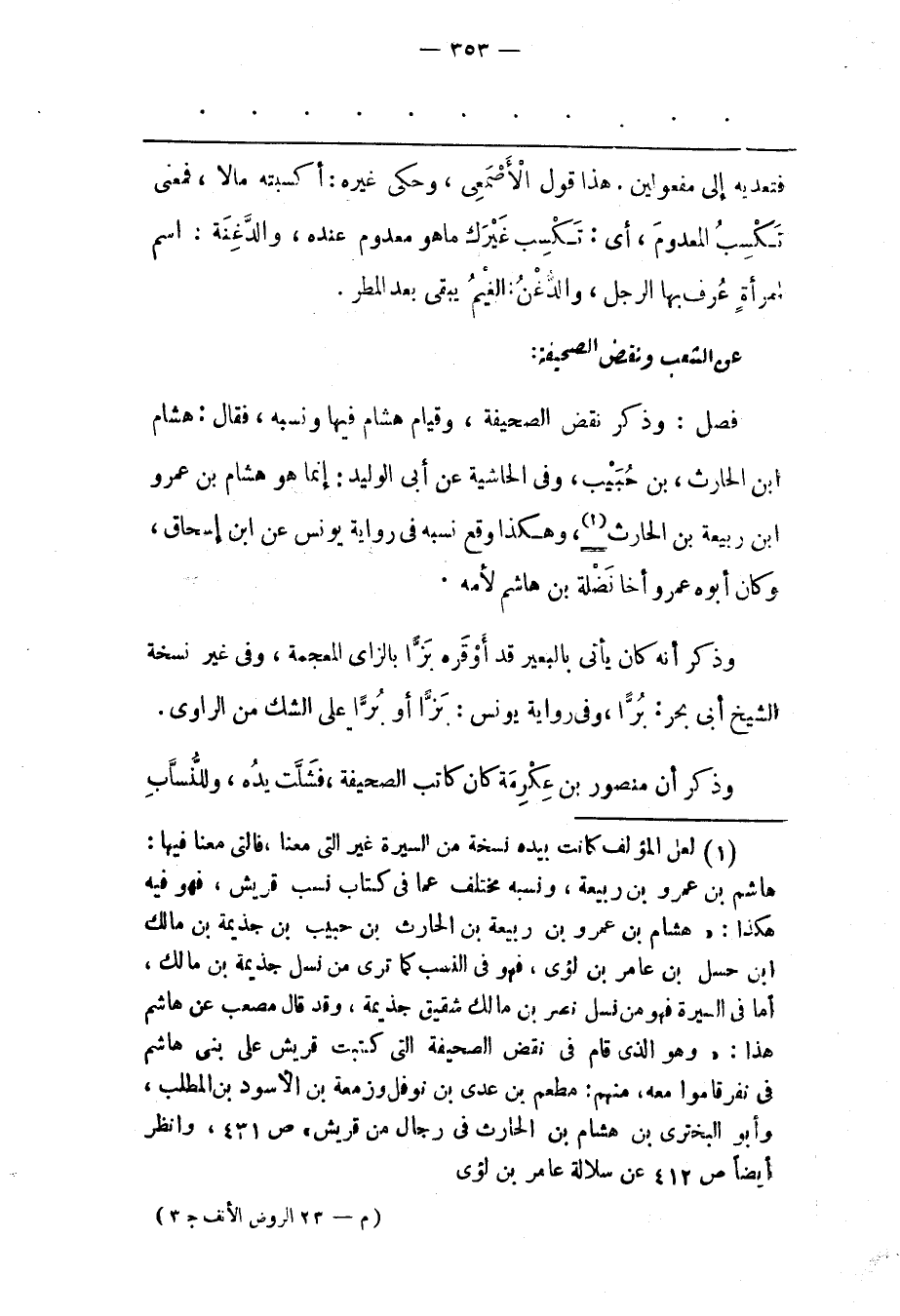 فَصْلٌ: وَذَكَرَ نَقْضَ الصّحِيفَةِ، وَقِيَامَ هِشَامٍ فِيهَا وَنَسَبَهُ، فقال: هشام ابن الْحَارِثِ، بْنُ حَبِيبٍ، وَفِي الْحَاشِيَةِ عَنْ أَبِي الوليد: إنما هو هشام بن عمرو ابن رَبِيعَةَ بْنِ الْحَارِثِ «1» ، وَهَكَذَا وَقَعَ نَسَبُهُ فِي رِوَايَةِ يُونُسَ عَنْ ابْنِ إسْحَاقَ، وَكَانَ أَبُوهُ عَمْرٌو أَخَا نَضْلَةَ بْنِ هَاشِمٍ لِأُمّهِ.