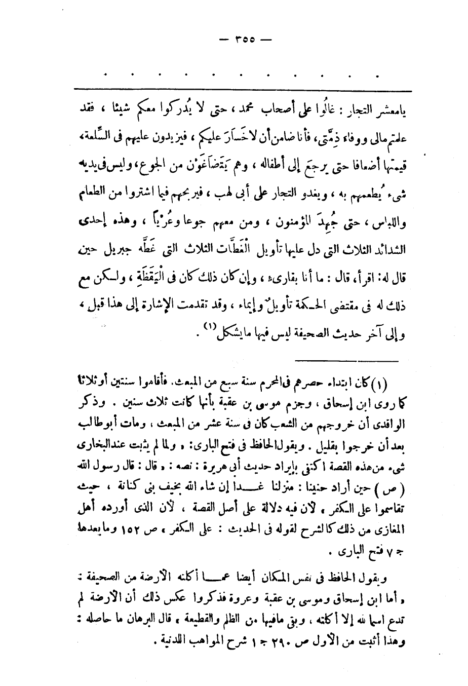 (1) كان ابتداء حصرهم فى المحرم سنة سبع من المبعث، فأقاموا سنتين أو ثلاثا كما روى ابن إسحاق، وجزم موسى بن عقبة بأنها كانت ثلاث سنين. وذكر الواقدى أن خروجهم من الشعب كان فى سنة عشر من المبعث، ومات أبو طالب بعد أن خرجوا بقليل. ويقول الحافظ فى فتح البارى: «ولما لم يثبت عند البخارى شىء من هذه القصة اكنفى بإيراد حديث أبى هريرة: نصه: «قال: قال رسول الله (ص) حين أراد حنينا: منزلنا غدا إن شاء الله بخيف بنى كنانة، حيث تقاسموا على الكفر» لأن فيه دلالة على أصل القصة، لأن الذى أورده أهل المغازى من ذلك كالشرح لقوله فى الحديث: على الكفر» ص 152 وما بعدها ج 7 فتح البارى. ويقول الحافظ فى نفس المكان أيضا عما أكلته الأرضة من الصحيفة: «أما ابن إسحاق وموسى بن عقبة وعروة فذكروا عكس ذلك أن الأرضة لم تدع اسما لله إلا أكلته، وبقى ما فيها من الظلم والقطيعة» قال البرهان ما حاصله: وهذا أثبت من الأول ص 290 ج 1 شرح المواهب اللدنية.