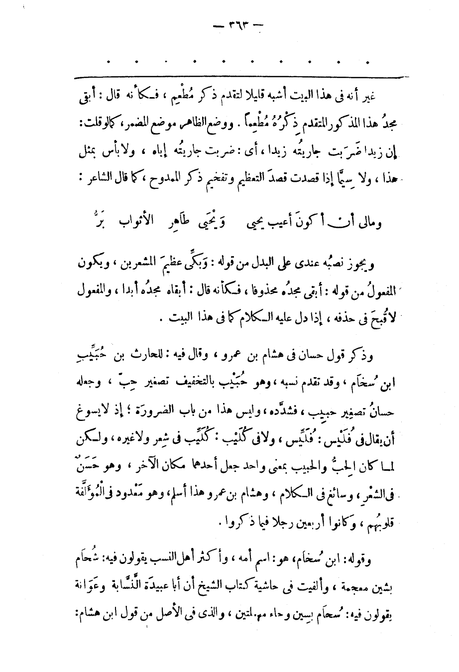وَذَكَرَ قَوْلَ حَسّانَ فِي هِشَامِ بْنِ عمرو، وقال فيه: للحارث بن حبيّب ابن سُخَامٍ، وَقَدْ تَقَدّمَ نَسَبُهُ، وَهُوَ حُبَيْبٌ بِالتّخْفِيفِ تَصْغِيرُ حِبّ، وَجَعَلَهُ حَسّانُ تَصْغِيرَ حَبِيبٍ، فَشَدّدَهُ، وَلَيْسَ هَذَا مِنْ بَابِ الضّرُورَةِ؛ إذْ لَا يَسُوغُ أَنْ يُقَالَ فِي فُلَيْسٍ: فُلَيّسٍ، وَلَا فِي كُلَيْبٍ: كُلَيّبٍ فِي شِعْرٍ وَلَا غَيْرِهِ، وَلَكِنْ لَمّا كَانَ الْحِبّ وَالْحَبِيبُ بِمَعْنَى وَاحِدٍ جَعَلَ أَحَدُهُمَا مَكَانَ الْآخَرِ، وَهُوَ حَسَنٌ فِي الشّعْرِ، وَسَائِغٌ فِي الْكَلَامِ، وَهِشَامُ بْنُ عَمْرٍو هَذَا أَسْلَمُ، وَهُوَ مَعْدُودٌ فِي الْمُؤَلّفَةِ قُلُوبُهُمْ، وَكَانُوا أَرْبَعِينَ رَجُلًا فِيمَا ذَكَرُوا.