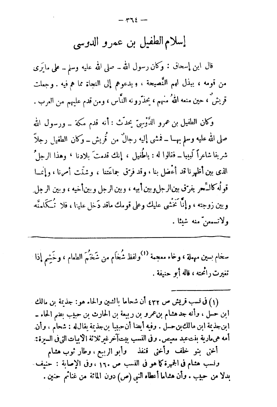 وَكَانَ الطّفَيْلُ بْنُ عَمْرٍو الدّوْسِيّ يُحَدّثُ: أَنّهُ قَدِمَ مَكّةَ- وَرَسُولُ اللهِ صَلّى اللهُ عَلَيْهِ وَسَلّمَ بِهَا- فَمَشَى إلَيْهِ رِجَالٌ مِنْ قُرَيْشٍ- وَكَانَ الطّفَيْلُ رَجُلًا شَرِيفًا شَاعِرًا لَبِيبًا- فَقَالُوا لَهُ: يَا طُفَيْلُ، إنّك قَدِمْتَ بِلَادَنَا، وَهَذَا الرّجُلُ الّذِي بَيْنَ أَظْهُرِنَا قَدْ أَعْضَلَ بِنَا، وَقَدْ فَرّقَ جَمَاعَتَنَا، وَشَتّتْ أَمْرَنَا، وَإِنّمَا قَوْلُهُ كَالسّحْرِ يُفَرّقُ بَيْنَ الرّجُلِ وَبَيْنَ أَبِيهِ، وَبَيْنَ الرّجُلِ وَبَيْنَ أَخِيهِ، وَبَيْنَ الرّجُلِ وَبَيْنَ زَوْجَتِهِ، وَإِنّا نَخْشَى عَلَيْك وَعَلَى قَوْمِك مَا قَدْ دَخَلَ عَلَيْنَا، فَلَا تُكَلّمَنّهُ وَلَا تسمعنّ منه شيئا.