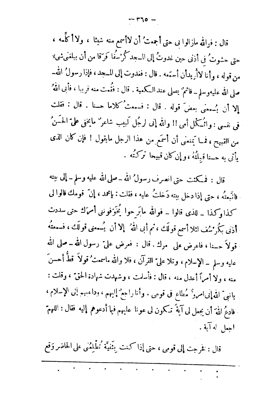 قَالَ: فَمَكَثْت حَتّى انْصَرَفَ رَسُولُ اللهِ- صَلّى اللهُ عَلَيْهِ وَسَلّمَ- إلَى بَيْتِهِ فَاتّبَعْتُهُ، حَتّى إذَا دَخَلَ بَيْتَهُ دَخَلْتُ عَلَيْهِ، فَقُلْت: يَا محمد، إنّ قومك قالوا لى كذا وكذا- للذى قالوا- فو الله مَا بَرِحُوا يُخَوّفُونَنِي أَمْرَك حَتّى سَدَدْت أُذُنَيّ بِكُرْسُفٍ لِئَلّا أَسْمَعَ قَوْلَك، ثُمّ أَبَى اللهُ إلّا أَنْ يُسْمِعَنِي قَوْلَك، فَسَمِعْتُهُ قَوْلًا حَسَنًا، فاعرض على مرك. قَالَ: فَعَرَضَ عَلَى رَسُولِ اللهِ- صَلَّى اللَّهُ عَلَيْهِ وَسَلَّمَ- الْإِسْلَامَ، وَتَلَا عَلَيّ الْقُرْآنَ، فَلَا وَاَللهِ مَا سَمِعْتُ قَوْلًا قَطّ أَحْسَنَ مِنْهُ، وَلَا أَمْرًا أَعْدَلَ مِنْهُ، قَالَ: فَأَسْلَمْت، وَشَهِدْت شَهَادَةَ الْحَقّ، وَقُلْت: