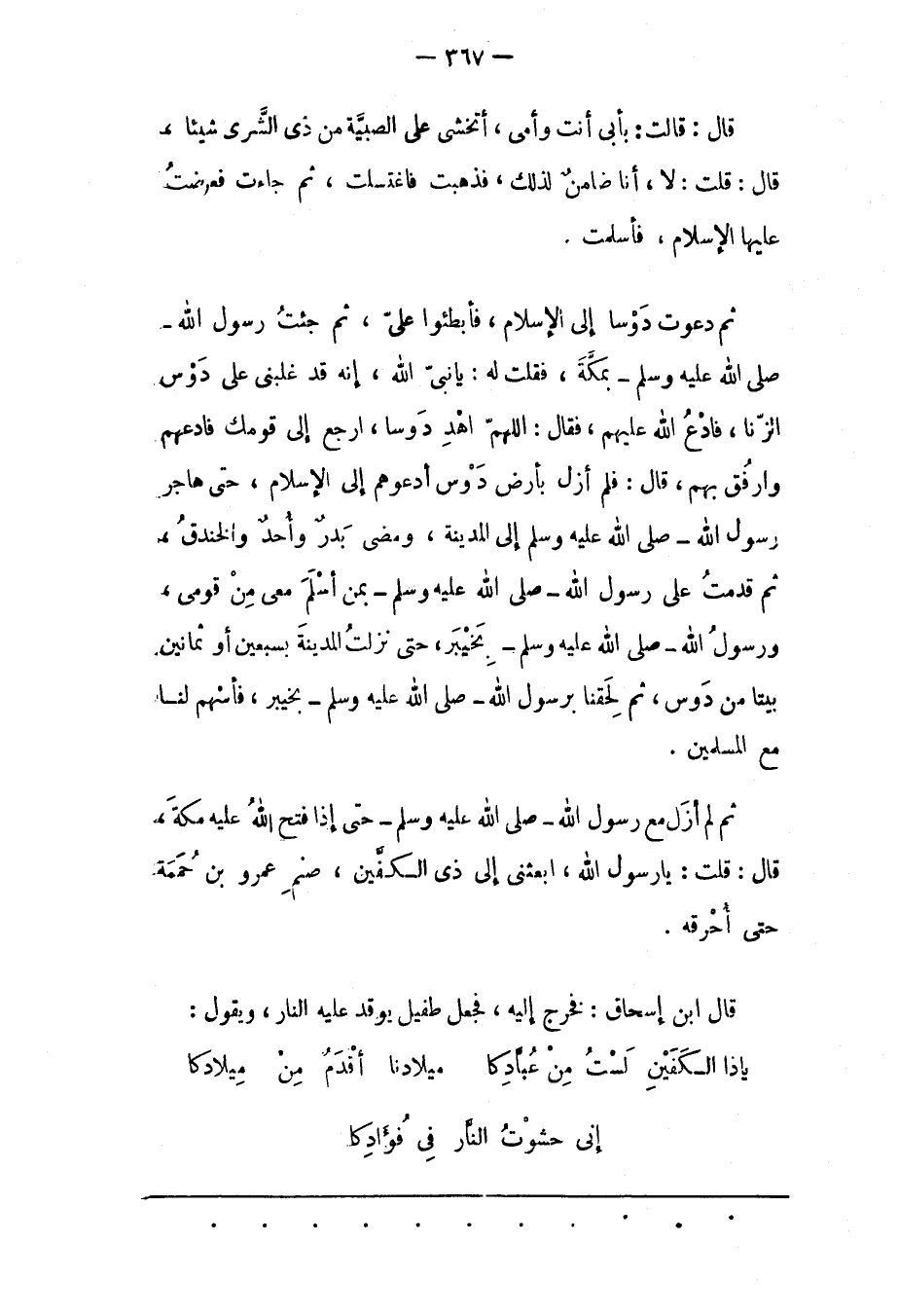 ثُمّ دَعَوْت دَوْسًا إلَى الْإِسْلَامِ، فَأَبْطَئُوا عَلَيّ، ثُمّ جِئْتُ رَسُولِ اللهِ- صَلَّى اللَّهُ عَلَيْهِ وَسَلَّمَ- بِمَكّةَ، فَقُلْت لَهُ: يَا نَبِيّ اللهِ، إنّهُ قَدْ غَلَبَنِي عَلَى دوس الزّنا، فَادْعُ اللهَ عَلَيْهِمْ، فَقَالَ: اللهُمّ اهْدِ دَوْسًا، ارْجِعْ إلَى قَوْمِك فَادْعُهُمْ وَارْفُقْ بِهِمْ، قَالَ: فَلَمْ أَزَلْ بِأَرْضِ دَوْسٍ أَدْعُوهُمْ إلَى الْإِسْلَامِ، حَتّى هَاجَرَ رَسُولُ اللهِ- صَلَّى اللَّهُ عَلَيْهِ وَسَلَّمَ إلَى الْمَدِينَةِ، وَمَضَى بَدْرٌ وَأُحُدٌ وَالْخَنْدَقُ، ثم قدمت عَلَى رَسُولِ اللهِ- صَلَّى اللَّهُ عَلَيْهِ وَسَلَّمَ- بِمَنْ أَسْلَمَ مَعِي مِنْ قَوْمِي، وَرَسُولُ اللهِ- صَلّى اللهُ عَلَيْهِ وَسَلّمَ- بِخَيْبَرِ، حَتّى نَزَلْتُ الْمَدِينَةَ بِسَبْعِينَ أَوْ ثَمَانِينَ بَيْتًا مِنْ دَوْسٍ، ثُمّ لَحِقْنَا بِرَسُولِ اللهِ- صَلّى اللهُ عَلَيْهِ وَسَلّمَ- بِخَيْبَرِ، فَأَسْهَمَ لَنَا مَعَ الْمُسْلِمِينَ.
