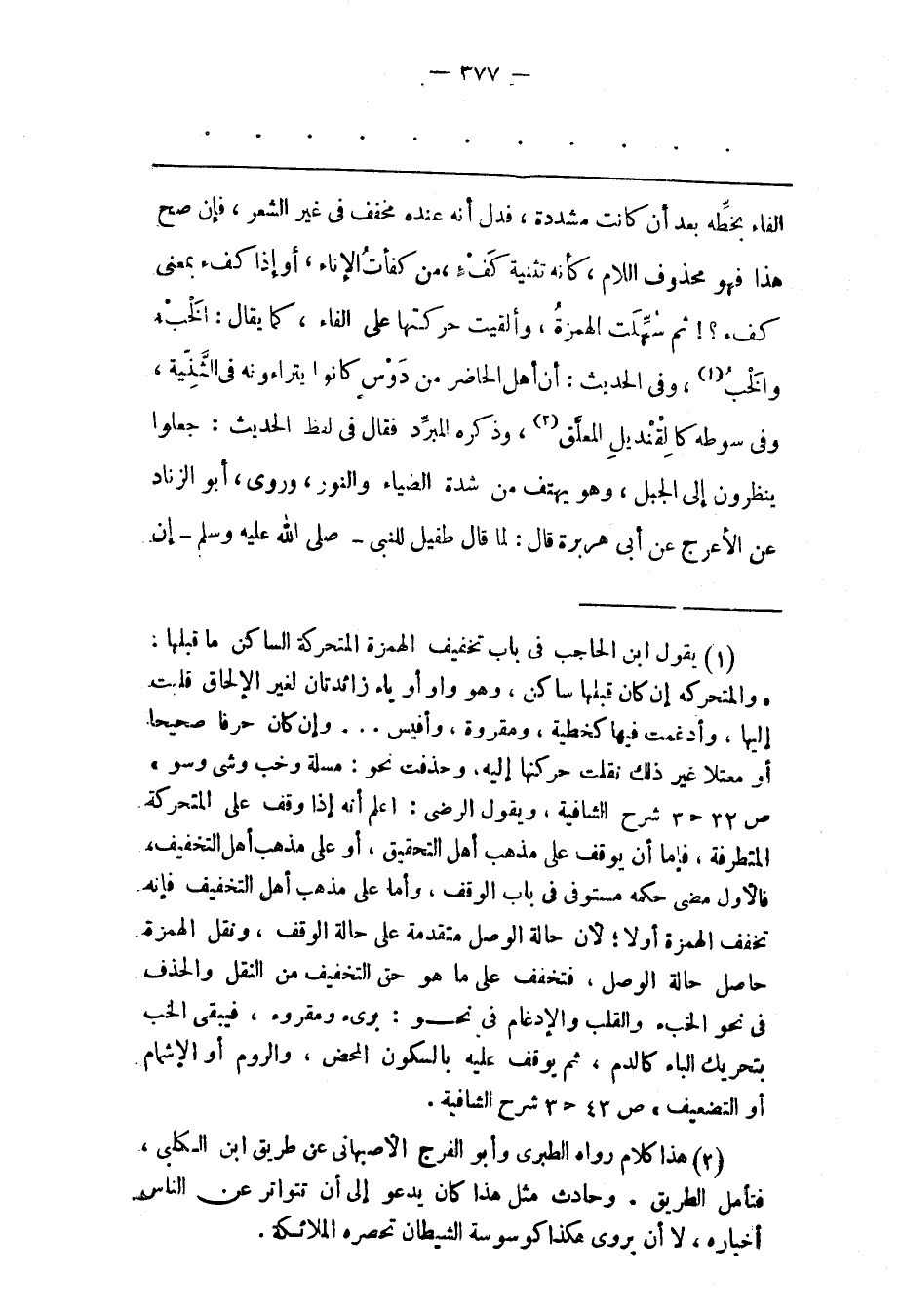 (1) يقول ابن الحاجب فى باب تخفيف الهمزة المتحركة الساكن ما قبلها: «والمتحركة إن كان قبلها ساكن، وهو واو أو ياء زائدتان لغير الإلحاق قلبت إليها، وأدغمت فيها كخطية، ومقروة، وأفيس ... وإن كان حرفا صحيحا أو معتلا غير ذلك نقلت حركتها إليه، وحذفت نحو: مسلة وخب وشى وسو» ص 32 ح 3 شرح الشافية، ويقول الرضى: اعلم أنه إذا وقف على المتحركة المتطرفة، فإما أن يوقف على مذهب أهل التحقيق، أو على مذهب أهل التخفيف، فالأول مضى حكمه مستوفى فى باب الوقف، وأما على مذهب أهل التخفيف فإنه تخفف الهمزة أولا؛ لأن حالة الوصل متقدمة على حالة الوقف، ونقل الهمزة حاصل حالة الوصل، فتخفف على ما هو حق التخفيف من النقل والحذف فى نحو الخبء والقلب والإدغام فى نحو: برئ ومقروء، فيبقى الخب بتحريك الباء كالدم، ثم يوقف عليه بالسكون المحض، والروم أو الإشمام أو التضعيف» ص 43 ح 3 شرح الشافية.