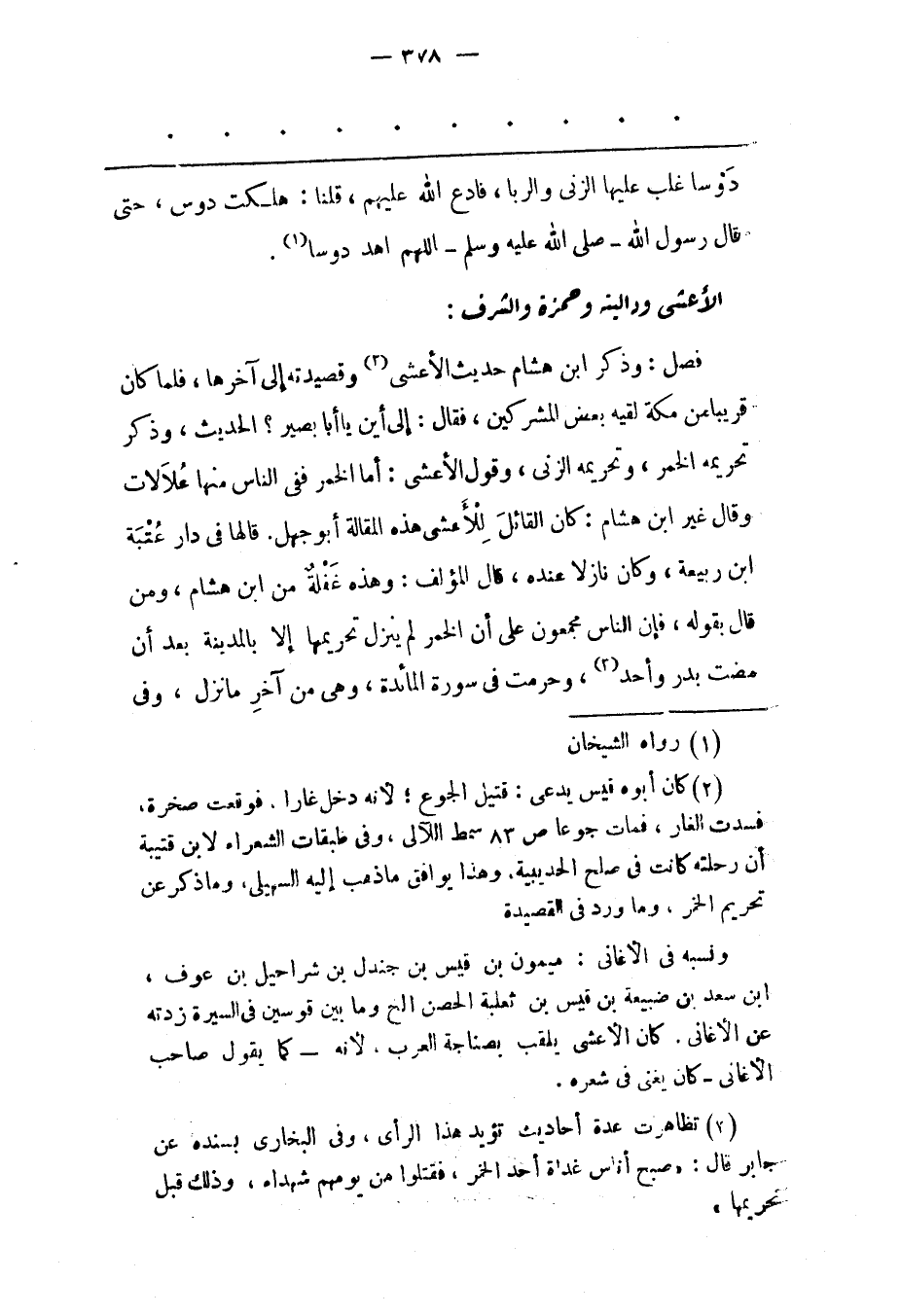 فَصْلٌ: وَذَكَرَ ابْنُ هِشَامٍ حَدِيثَ الْأَعْشَى «2» وَقَصِيدَتَهُ إلَى آخِرِهَا، فَلَمّا كَانَ قَرِيبًا مِنْ مَكّةَ لَقِيَهُ بَعْضُ الْمُشْرِكِينَ، فَقَالَ: إلَى أَيْنَ يَا أَبَا بِصَيْرِ؟ الْحَدِيثَ، وَذَكَرَ تَحْرِيمَهُ الْخَمْرَ، وَتَحْرِيمَهُ الزّنَى، وَقَوْلُ الْأَعْشَى: أَمّا الْخَمْر فَفِي النّاسِ مِنْهَا عُلَالَاتٌ وَقَالَ غَيْرُ ابْنِ هِشَامٍ: كَانَ الْقَائِلُ لِلْأَعْشَى هَذِهِ الْمَقَالَةُ أَبُو جهل. قالها فى دار عتبة ابن رَبِيعَةَ، وَكَانَ نَازِلًا عِنْدَهُ، قَالَ الْمُؤَلّفُ: وَهَذِهِ غَفْلَةٌ مِنْ ابْنِ هِشَامٍ، وَمَنْ قَالَ بِقَوْلِهِ، فَإِنّ النّاسَ مُجْمِعُونَ عَلَى أَنّ الْخَمْرَ لَمْ يَنْزِلْ تَحْرِيمُهَا إلّا بِالْمَدِينَةِ بَعْدَ أَنْ مَضَتْ بَدْرٌ وَأُحُدٌ «3» ، وَحُرّمَتْ فِي سُورَةِ الْمَائِدَةِ، وَهِيَ من آخر ما نزل، وفى