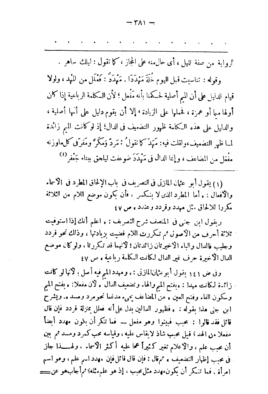 (1) يقول أبو عثمان المازنى فى التصريف فى باب الإلحاق المطرد فى الأسماء والأفعال: «أما المطرد الذى لا ينكسر، فأن يكون موضع اللام من الثلاثة مكررا للالحاق مثل مهدد وقردد وعندد» ص 47 ويقول ابن جنى فى المنصف شرح التصريف: «اعلم أنك إذا استوفيت ثلاثة أحرف من الأصول ثم تكررت اللام قضيت بزيادتها، وذلك نحو قردد وجلبب فالدال والباء الأخيرتان زائدتان؛ لأنهما قد تكررتا، ولو كان موضع الدال الأخيرة حرف غير الدال لكانت الكلمة رباعية» ص 47 وفى ض 141 يقول أبو عثمان المازنى: «ومهدد الميم فيه أصل؛ لأنها لو كانت زائدة لكانت مهدا: «بفتح الميم والهاء وتضعيف الدال» لأن مفعلا: «بفتح الميم وسكون الفاء وفتح العين» من المضاعف يحئ مدغما نحو مرد ومسد» . ويشرح ابن جنى هذا بقوله: «فظهور الدالين يدل على أنه فعلل بمنزلة قردد فإن قال قائل فقد قالوا: محبب فبينوا وهو مفعل- فما تنكر أن يكون مهدد أيضا مفعلا من الهد؟ قيل محبب شاذ لا يقاس عليه، وقياسه محب كمرد ومسد ثم بين أن محبب علم، والأعلام تغير كثيرا عما عليه أكثر الأسماء، ولهذا جاز فى محبب إظهار التضعيف» ثم قال: فإن قال قائل فإن مهدد اسم علم، وهو اسم امرأة، لما تنكر أن يكون مهدد مثل محبب، إذ هو علم مثله؟ ثم أجاب هو عن-