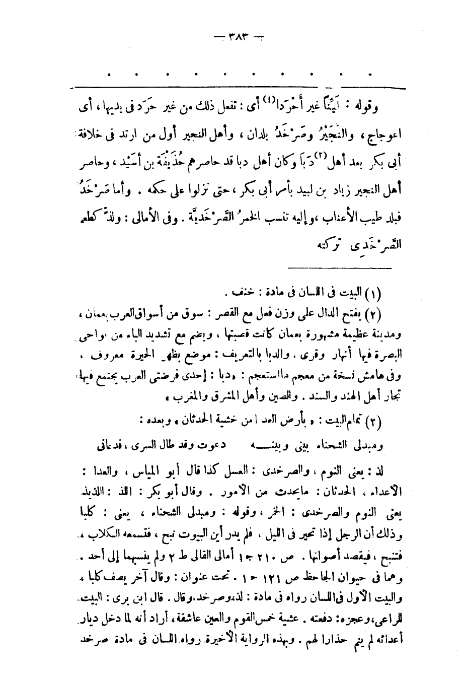 وَقَوْله: لَيّنًا غَيْرَ أَحْرَدَا «1» أَيْ: تَفْعَلُ ذَلِكَ مِنْ غَيْرِ حَرَدٍ فِي يَدَيْهَا، أَيْ اعْوِجَاجٌ، وَالنّجَيْرُ وَصَرْخَدُ بَلَدَانِ، وَأَهْلُ النّجَيْرِ أَوّلُ مَنْ ارْتَدّ فِي خِلَافَةِ أَبِي بَكْرٍ بَعْدَ أَهْلِ دَبّا «2» وَكَانَ أَهْل دُبّا قَدْ حَاصَرَهُمْ حُذَيْفَةُ بْنُ أُسَيْدٍ، وَحَاصَرَ أَهْلَ النّجَيْرِ زِيَادُ بْنُ لَبِيدٍ بِأَمْرِ أَبِي بَكْرٍ، حَتّى نَزَلُوا عَلَى حُكْمِهِ. وَأَمّا صَرْخَدُ فَبَلَدٌ طَيّبُ الْأَعْنَابِ، وَإِلَيْهِ تُنْسَبُ الْخَمْرُ الصّرْخَدِيّةُ. وَفِي الْأَمَالِي: