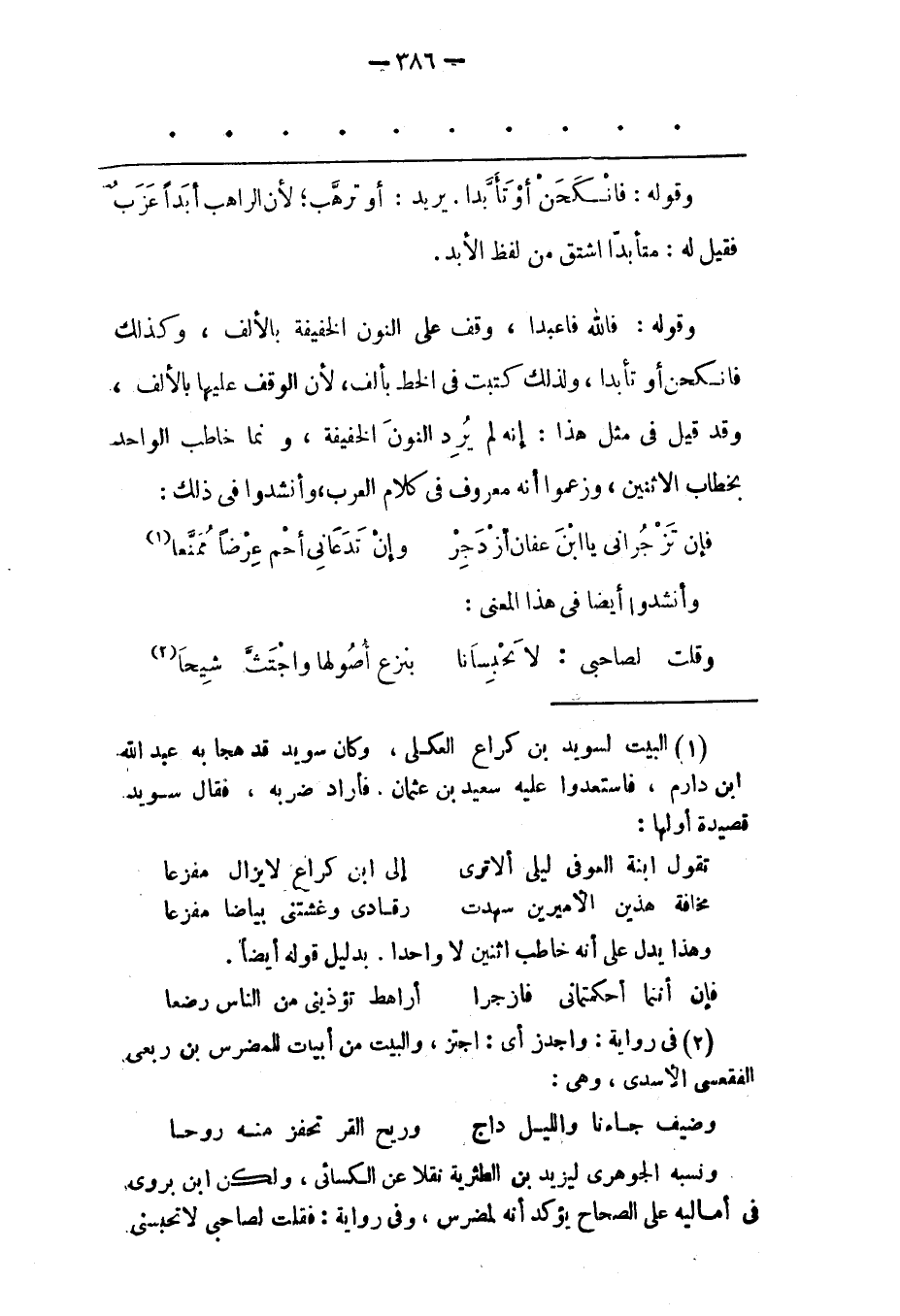وَقَوْلُهُ: فَاَللهَ فَاعْبُدَا، وَقَفَ عَلَى النّونِ الْخَفِيفَةِ بِالْأَلِفِ، وَكَذَلِكَ فَانْكَحَنْ أَوْ تَأَبّدَا، وَلِذَلِكَ كَتَبْت فِي الْخَطّ بِأَلْفِ، لِأَنّ الْوُقْفَ عَلَيْهَا بِالْأَلِفِ، وَقَدْ قِيلَ فِي مِثْلِ هَذَا: إنّهُ لَمْ يَرُدّ النّونَ الْخَفِيفَةَ، ونما خَاطَبَ الْوَاحِد بِخِطَابِ الِاثْنَيْنِ، وَزَعَمُوا أَنّهُ مَعْرُوفٌ فِي كَلَامِ الْعَرَبِ، وَأَنْشَدُوا فِي ذَلِكَ: