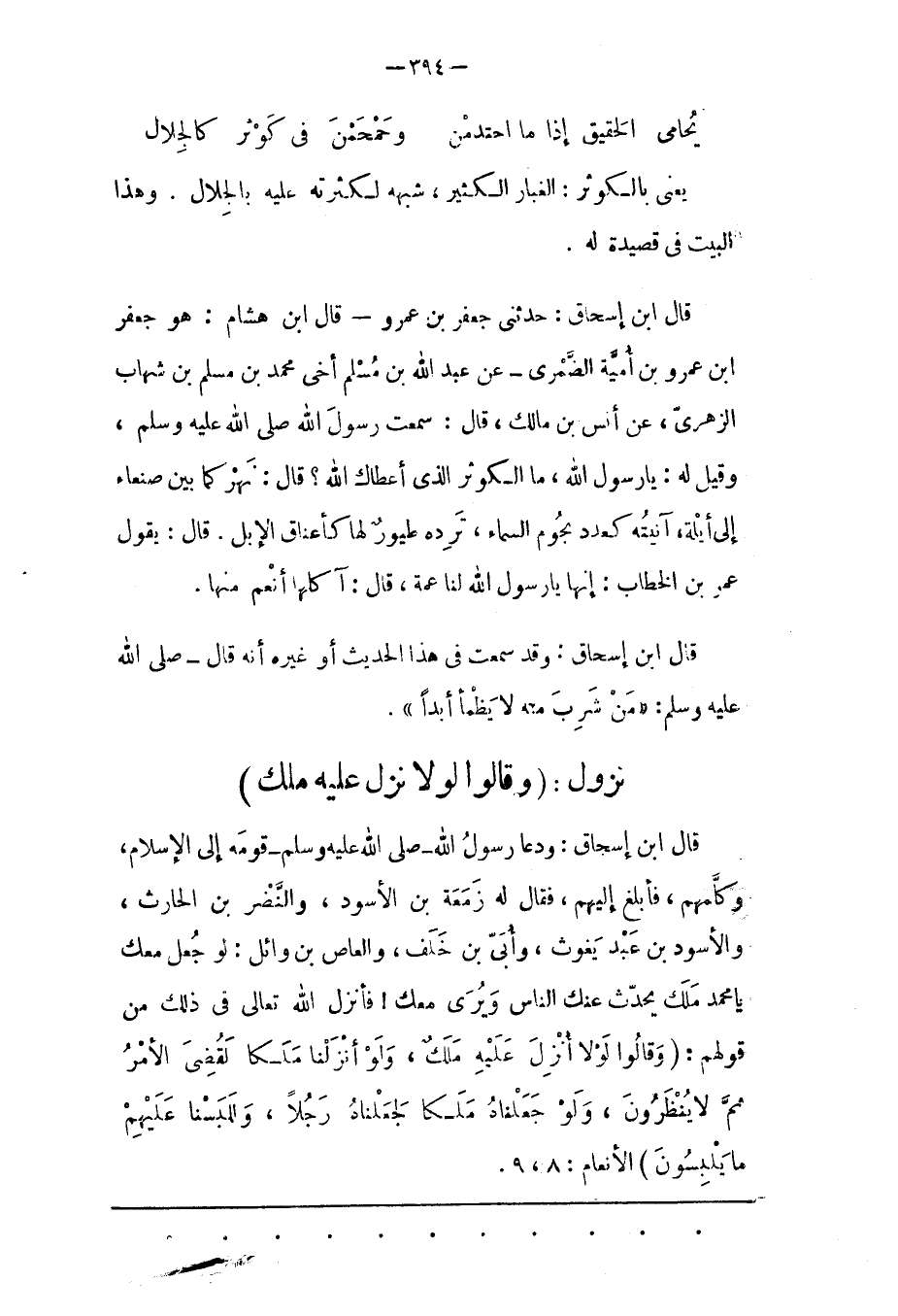 قَالَ ابْنُ إسْحَاقَ: حَدّثَنِي جَعْفَرُ بْنُ عَمْرٍو- قال ابن هشام: هو جعفر ابن عمرو بن أميّة الضّمْرِيّ- عَنْ عَبْدِ اللهِ بْنِ مُسْلِمٍ أَخِي محمد بن مسلم بن شهاب الزهري، عن أَنَسِ بْنِ مَالِكٍ، قَالَ: سَمِعْت رَسُولَ اللهِ صَلَّى اللَّهُ عَلَيْهِ وَسَلَّمَ، وَقِيلَ لَهُ: يَا رَسُولَ اللهِ، مَا الْكَوْثَرُ الّذِي أَعْطَاك اللهُ؟ قَالَ: نَهْرٌ كَمَا بَيْنَ صَنْعَاءَ إلَى أَيْلَةَ، آنِيَتُهُ كَعَدَدِ نُجُومِ السّمَاءِ، تَرِدُهُ طُيُورٌ لَهَا كَأَعْنَاقِ الْإِبِلِ. قَالَ: يَقُولُ عُمَرُ بْنُ الْخَطّابِ: إنها يا رسول الله لنا عمة، قَالَ: آكِلُهَا أَنْعَمُ مِنْهَا.