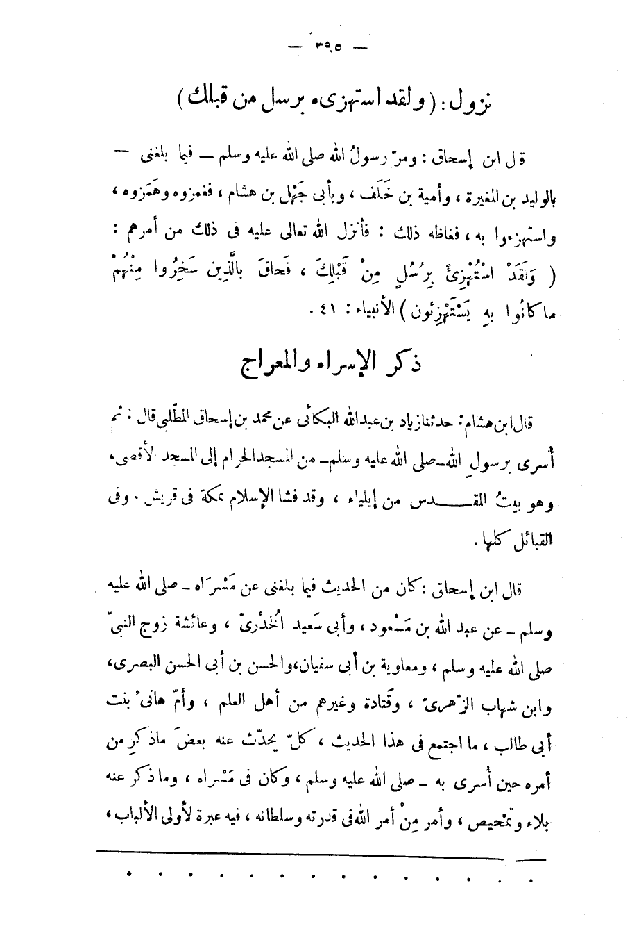 قَالَ ابْنُ هِشَامٍ: حَدّثَنَا زياد بن عبد الله البكائي عن محمد بْنِ إسْحَاقَ الْمُطّلِبِيّ قَالَ: ثُمّ أُسْرِيَ بِرَسُولِ اللهِ- صَلَّى اللَّهُ عَلَيْهِ وَسَلَّمَ- مِنْ الْمَسْجِدِ الْحَرَامِ إلَى الْمَسْجِدِ الْأَقْصَى، وَهُوَ بَيْتُ الْمَقْدِسِ مِنْ إيلِيَاء، وَقَدْ فَشَا الْإِسْلَامُ بِمَكّةَ فِي قُرَيْشٍ، وَفِي الْقَبَائِلِ كُلّهَا.