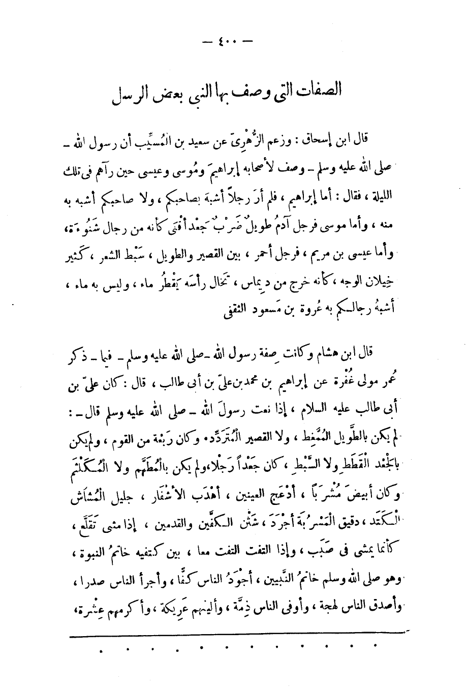 قَالَ ابْنُ إسْحَاقَ: وَزَعَمَ الزّهْرِيّ عَنْ سَعِيدِ بْنِ الْمُسَيّبِ أَنّ رَسُولَ اللهِ- صَلّى اللهُ عَلَيْهِ وَسَلّمَ- وَصَفَ لِأَصْحَابِهِ إبْرَاهِيمَ وَمُوسَى وَعِيسَى حِينَ رَآهُمْ فِي تِلْكَ اللّيْلَةِ، فَقَالَ: أَمّا إبراهيم، فلم أَرَ رَجُلًا أَشَبَهَ بِصَاحِبِكُمْ، وَلَا صَاحِبُكُمْ أَشَبَهَ بِهِ مِنْهُ، وَأَمّا مُوسَى فَرَجُلٌ آدَمُ طَوِيلٌ ضَرْبٌ جَعْدٌ أَقْنَى كَأَنّهُ مِنْ رِجَالِ شَنُوءَةَ، وَأَمّا عِيسَى بْنُ مَرْيَمَ، فَرَجُلٌ أَحْمَرُ، بَيْنَ الْقَصِيرِ وَالطّوِيلِ، سَبْطُ الشّعَرِ، كَثِيرُ خِيلَانِ الْوَجْهِ، كَأَنّهُ خَرَجَ مِنْ دِيمَاسٍ، تَخَالُ رَأْسَهُ يَقْطُرُ مَاءً، وَلَيْسَ بِهِ مَاءٌ، أَشْبَهُ رِجَالِكُمْ بِهِ عروة بن مسعود الثقفى