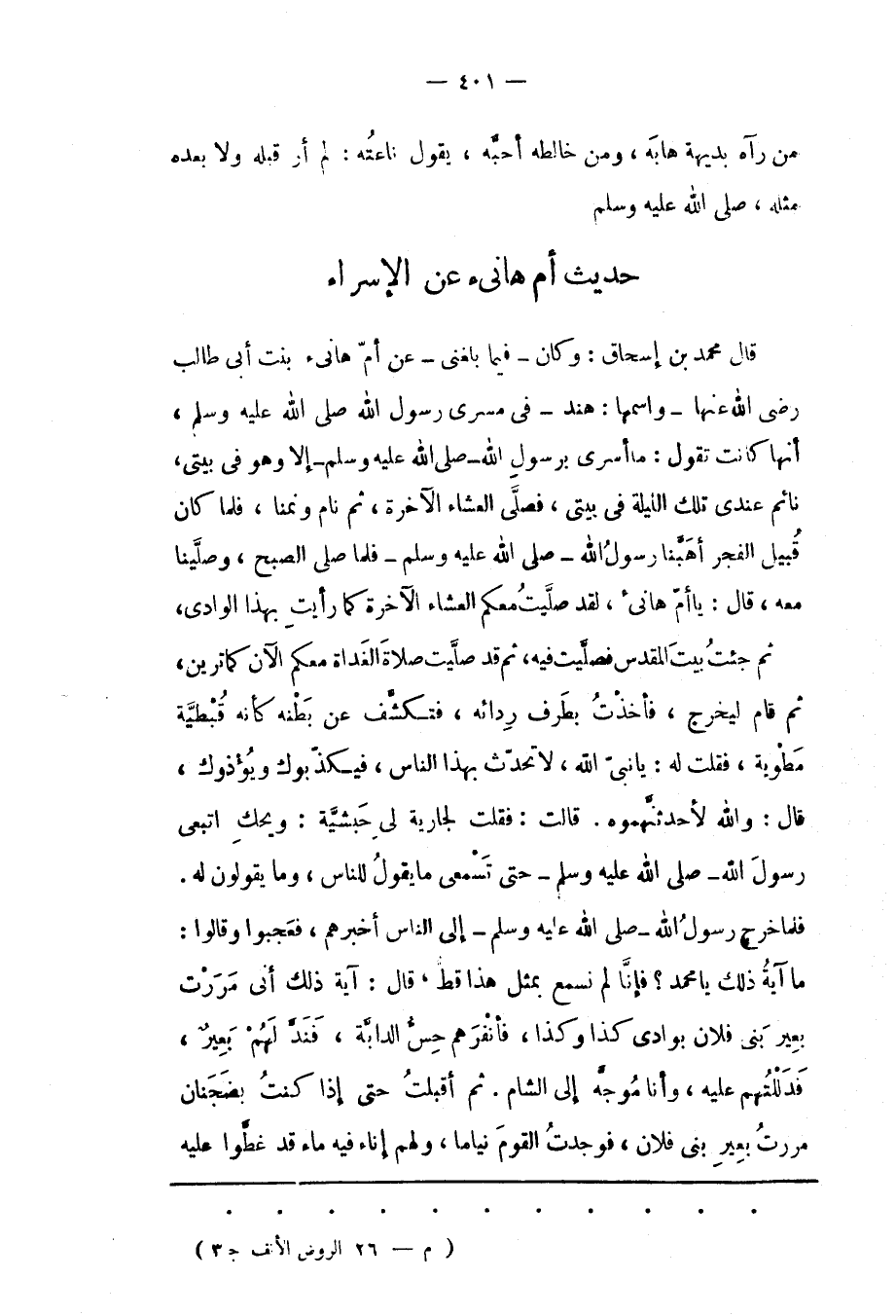 قَالَ مُحَمّدُ بْنُ إسْحَاقَ: وَكَانَ- فِيمَا بَلَغَنِي- عَنْ أُمّ هَانِئِ بِنْتِ أَبِي طَالِبٍ رَضِيَ اللهُ عَنْهَا- وَاسْمُهَا: هِنْدٌ- فِي مَسْرَى رَسُولِ اللهِ صَلّى اللهُ عَلَيْهِ وَسَلّمَ، أَنّهَا كَانَتْ تَقُولُ: مَا أُسْرِيَ بِرَسُولِ اللهِ- صَلَّى اللَّهُ عَلَيْهِ وَسَلَّمَ- إلا وهو فى بيتى، نائم عِنْدِي تِلْكَ اللّيْلَةَ فِي بَيْتِي، فَصَلّى الْعِشَاءَ الْآخِرَةَ، ثُمّ نَامَ وَنِمْنَا، فَلَمّا كَانَ قُبَيْلَ الْفَجْرِ أَهَبّنَا رَسُولُ اللهِ- صَلّى اللهُ عَلَيْهِ وَسَلّمَ- فَلَمّا صَلّى الصّبْحَ، وَصَلّيْنَا مَعَهُ، قَالَ: يَا أُمّ هَانِئٍ، لَقَدْ صَلّيْتُ مَعَكُمْ الْعِشَاءَ الْآخِرَةَ كَمَا رَأَيْتِ بِهَذَا الْوَادِي، ثُمّ جِئْتُ بَيْتَ الْمَقْدِسِ فَصَلّيْت فِيهِ، ثُمّ قَدْ صَلّيْت صَلَاةَ الْغَدَاةِ مَعَكُمْ الْآنَ كَمَا تَرَيْنَ، ثُمّ قال لِيَخْرُجَ، فَأَخَذْتُ بِطَرَفِ رِدَائِهِ، فَتَكَشّفَ عَنْ بَطْنِهِ كَأَنّهُ قُبْطِيّةٌ مَطْوِيّةٌ، فَقُلْت لَهُ: يَا نَبِيّ اللهِ، لَا تُحَدّثْ بِهَذَا النّاسَ، فَيُكَذّبُوك وَيُؤْذُوك، قَالَ: وَاَللهِ لأحدثنهموه. قَالَتْ: فَقُلْت لِجَارِيَةِ لِي حَبَشِيّةٍ: وَيْحَك اتْبَعِي رَسُولَ اللهِ- صَلّى اللهُ عَلَيْهِ وَسَلّمَ- حَتّى تَسْمَعِي مَا يَقُولُ لِلنّاسِ، وَمَا يَقُولُونَ لَهُ.