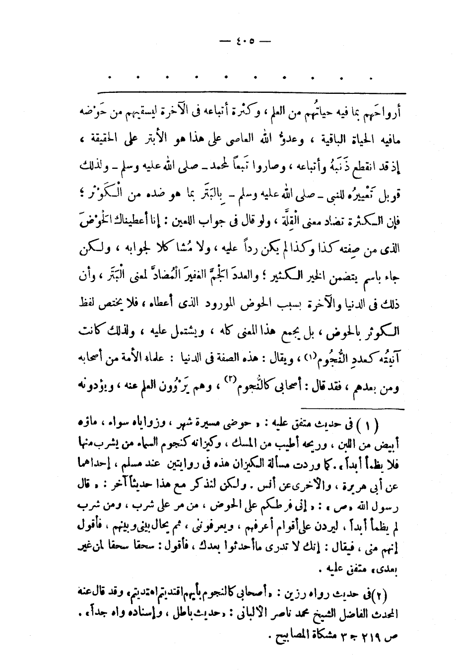أَرْوَاحَهُمْ بِمَا فِيهِ حَيَاتُهُمْ مِنْ الْعِلْمِ، وَكَثْرَةِ أَتْبَاعِهِ فِي الْآخِرَةِ لِيَسْقِيَهُمْ مِنْ حَوْضِهِ مَا فِيهِ الْحَيَاةُ الْبَاقِيَةُ، وَعَدُوّ اللهِ الْعَاصِي عَلَى هَذَا هُوَ الْأَبْتَرُ عَلَى الْحَقِيقَةِ، إذْ قَدْ انْقَطَعَ ذَنَبُهُ وَأَتْبَاعُهُ، وَصَارُوا تَبَعًا لِمُحَمّدِ- صَلَّى اللَّهُ عَلَيْهِ وَسَلَّمَ- وَلِذَلِكَ قُوبِلَ تَعْيِيرُهُ لِلنّبِيّ- صَلَّى اللَّهُ عَلَيْهِ وَسَلَّمَ- بِالْبَتْرِ بِمَا هُوَ ضِدّهُ مِنْ الْكَوْثَرِ؛ فَإِنّ الْكَثْرَةَ تُضَادّ مَعْنَى الْقِلّةِ، وَلَوْ قَالَ فِي جَوَابِ اللّعِينِ: إنّا أَعْطَيْنَاك الْحَوْضَ الّذِي مِنْ صِفَتِهِ كَذَا وَكَذَا لَمْ يَكُنْ رَدّا عَلَيْهِ، وَلَا مُشَاكِلًا لِجَوَابِهِ، وَلَكِنْ جَاءَ بِاسْمِ يَتَضَمّنُ الْخَيْرَ الْكَثِيرَ؛ وَالْعَدَدَ الْجَمّ الْغَفِيرَ الْمُضَادّ لِمَعْنَى الْبَتْرِ، وَأَنّ ذَلِكَ فِي الدّنْيَا وَالْآخِرَةِ بِسَبَبِ الْحَوْضِ الْمَوْرُودِ الّذِي أَعْطَاهُ، فَلَا يَخْتَصّ لَفْظُ الْكَوْثَرِ بِالْحَوْضِ، بَلْ يَجْمَعُ هَذَا الْمَعْنَى كُلّهُ، وَيَشْتَمِلُ عَلَيْهِ، وَلِذَلِكَ كَانَتْ آنِيَتُهُ كَعَدَدِ النّجُومِ «1» ، وَيُقَال: هَذِهِ الصّفَةُ فِي الدّنْيَا: عُلَمَاءُ الْأُمّةِ مِنْ أَصْحَابِهِ وَمِنْ بَعْدِهِمْ، فَقَدْ قَالَ: أَصْحَابِي كَالنّجُومِ «2» ، وَهُمْ يَرْوُونَ العلم عنه، ويؤدونه
