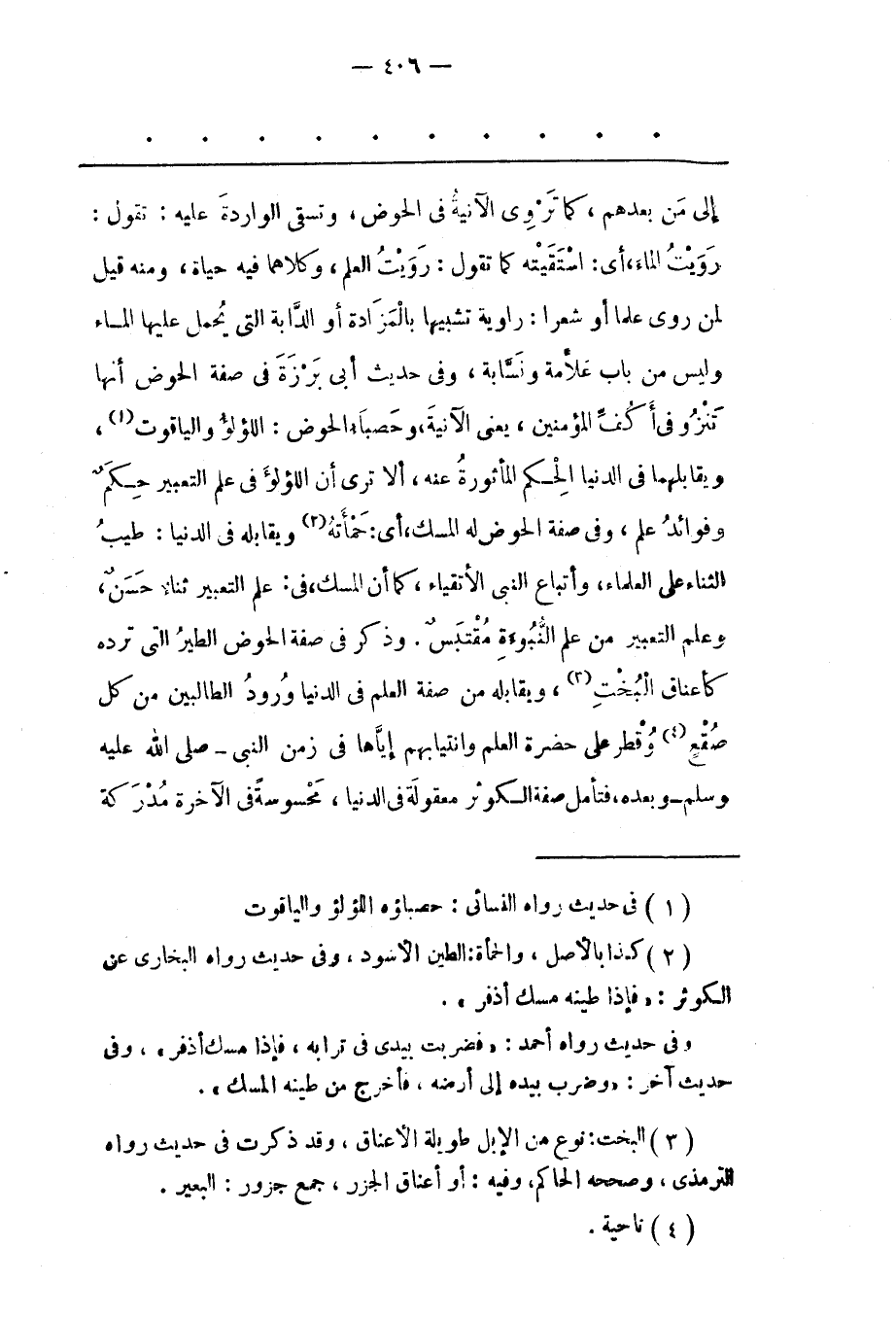 رَوَيْت الْمَاءَ، أَيْ: اسْتَقَيْته كَمَا تَقُولُ: رَوَيْت الْعِلْمَ، وَكِلَاهُمَا فِيهِ حَيَاةٌ، وَمِنْهُ قِيلَ لِمَنْ رَوَى عِلْمًا أَوْ شِعْرًا: رَاوِيَةً تَشْبِيهًا بِالْمَزَادَةِ أَوْ الدّابّةِ الّتِي يُحْمَلُ عَلَيْهَا الْمَاءُ وَلَيْسَ مِنْ بَابِ عَلّامَةٍ وَنَسّابَةٍ، وَفِي حَدِيثِ أَبِي بَرْزَةَ فِي صِفَةِ الْحَوْضِ أَنّهَا تَنْزُو فِي أَكُفّ الْمُؤْمِنِينَ، يَعْنِي الْآنِيّةَ، وَحَصْبَاءُ الْحَوْضِ: اللّؤْلُؤُ وَالْيَاقُوتِ «1» ، وَيُقَابِلُهُمَا فِي الدّنْيَا الْحِكَمُ الْمَأْثُورَةُ عَنْهُ، أَلّا تَرَى أَنّ اللّؤْلُؤَ فِي عِلْمِ التّعْبِيرِ حِكَمٌ وَفَوَائِدُ عِلْمٍ، وَفِي صِفَةِ الْحَوْضِ لَهُ الْمِسْكُ، أَيْ: حَمْأَتُهُ «2» وَيُقَابِلُهُ فِي الدّنْيَا: طِيبُ الثّنَاءِ عَلَى الْعُلَمَاءِ، وَأَتْبَاعِ النّبِيّ الْأَتْقِيَاءِ، كَمَا أَنّ الْمِسْكَ، فِي: عِلْمِ التّعْبِيرِ ثَنَاءٌ حَسَنٌ، وَعِلْمٌ التّعْبِيرِ مِنْ عِلْمِ النّبُوءَةِ مُقْتَبَسٌ. وَذَكَرَ فِي صِفَةِ الْحَوْضِ الطّيْرَ الّتِي تَرُدّهُ كَأَعْنَاقِ الْبُخْتِ «3» ، وَيُقَابِلُهُ مِنْ صِفَةِ الْعِلْمِ فِي الدّنْيَا وُرُودُ الطّالِبِينَ مِنْ كُلّ صُقْعٍ «4» وَقُطْرٍ عَلَى حَضْرَةِ الْعِلْمِ وَانْتِيَابِهِمْ إيّاهَا فِي زَمَنِ النّبِيّ- صَلَّى اللَّهُ عَلَيْهِ وَسَلَّمَ- وَبَعْدَهُ، فَتَأَمّلْ صِفَةَ الْكَوْثَرِ مَعْقُولَةٌ فِي الدّنْيَا، مَحْسُوسَةٌ فِي الْآخِرَةِ مدركة