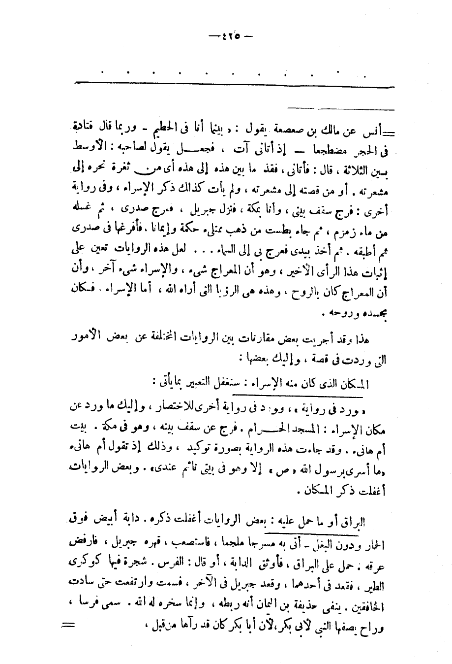 - أنس عن مالك بن صعصعة يقول: «بينما أنا فى الحطيم- وربما قال قتادة فى الحجر مضطجعا- إذ أتانى آت، فجعل يقول لصاحبه: الأوسط بين الثلاثة، قال: فأتانى، فقد ما بين هذه إلى هذه أى من ثغرة نحره إلى مشعرته. أو من قصته إلى مشعرته، ولم يأت كذلك ذكر الإسراء، وفى رواية أخرى: فرج سقف بينى، وأنا بمكة، فنزل جبريل، ففرج صدرى، ثم غسله من ماء زمزم، ثم جاء بطست من ذهب ممتلىء حكمة وإيمانا، فأفرغها فى صدرى ثم أطبقه، ثم أخذ بيدى فعرج بى إلى السماء ... لعل هذه الروايات تعين على إثبات هذا الرأى الأخير، وهو أن المعراج شىء، والإسراء شىء آخر، وأن أن المعراج كان بالروح، وهذه هى الرؤيا التى أراه الله، أما الإسراء، فكان بجسده وروحه. هذا وقد أجريت بعض مقارنات بين الروايات المختلفة عن بعض الأمور التى وردت فى قصة، وإليك بعضها: المكان الذى كان منه الإسراء: سنغفل التعبير بما يأتى: «ورد فى رواية» ، وورد فى رواية أخرى للاختصار، وإليك ما ورد عن مكان الإسراء: المسجد الحرام، فرج عن سقف بيته، وهو فى مكة. بيت أم هانىء. وقد جاءت هذه الرواية بصورة توكيد، وذلك إذ تقول أم هانىء «ما أسرى برسول الله «ص» إلا وهو فى بيتى نائم عندى» . وبعض الروايات أغفلت ذكر المكان. البراق أو ما حمل عليه: بعض الروايات أغفلت ذكره. دابة أبيض فوق الحمار ودون البغل- أتى به مسرجا ملجما، فاستصعب، قهره جبريل، فارفض عرقه. حمل على البراق، فأوثق الدابة، أو قال: الفرس. شجرة فيها كوكرى الطير، فقعد فى أحدهما، وقعد جبريل فى الاخر، فسمت وارتفعت حتى سادت الخافقين. ينفى حذيفة بن اليمان أنه ربطه، وإنما سخره له الله. سمى فرسا، وراح يصفها النبى لأبى بكر، لأن أبا بكر كان قد رآها من قبل،. . . . . . . . . . . . . . . . . . . . . . . . . . . . . . . . . .