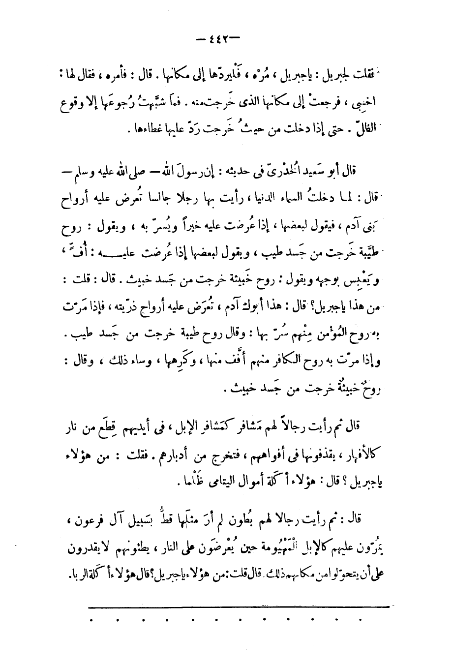 قَالَ أَبُو سَعِيدٍ الْخُدْرِيّ فِي حَدِيثِهِ: أَنّ رَسُولَ اللهِ- صَلَّى اللَّهُ عليه وسلم- قال: لَمّا دَخَلْتُ السّمَاءَ الدّنْيَا، رَأَيْت بِهَا رَجُلًا جَالِسًا تُعْرَضُ عَلَيْهِ أَرْوَاحُ بَنِي آدَمَ، فَيَقُولُ لِبَعْضِهَا، إذَا عُرِضَتْ عَلَيْهِ خَيْرًا وَيُسَرّ بِهِ، وَيَقُولُ: رُوحٌ طَيّبَةٌ خَرَجَتْ مِنْ جَسَدٍ طَيّبٍ، وَيَقُولُ لِبَعْضِهَا إذَا عُرِضَتْ عَلَيْهِ: أُفّ، وَيَعْبِسُ بِوَجْهِهِ وَيَقُولُ: رُوحٌ خَبِيثَةٌ خَرَجَتْ مِنْ جَسَدٍ خَبِيثٍ. قَالَ: قُلْت: