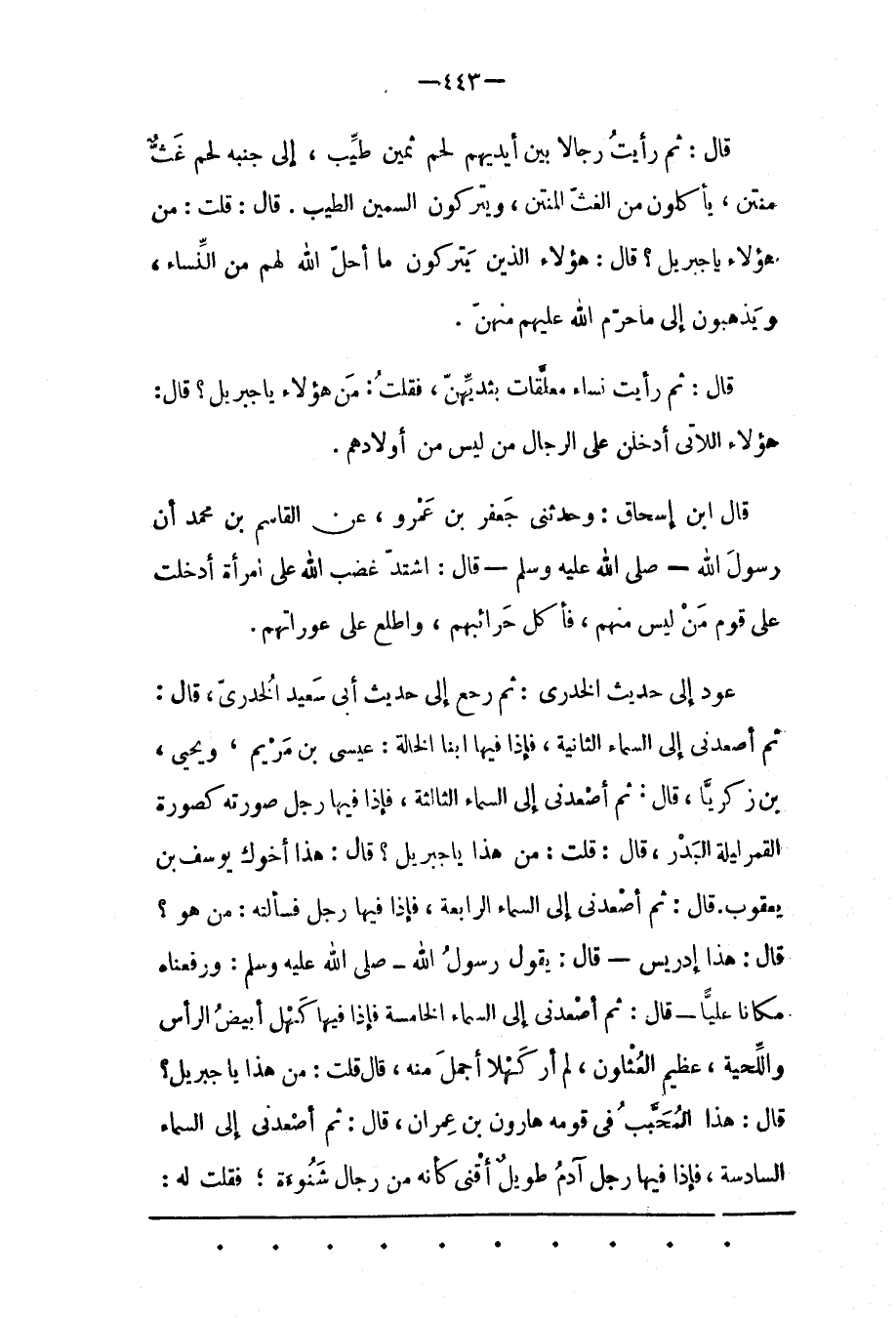 قَالَ: ثُمّ رَأَيْت رِجَالًا بَيْنَ أَيْدِيهِمْ لَحْمٌ ثَمِينٌ طَيّبٌ، إلَى جَنْبِهِ لَحْمٌ غَثّ مُنْتِنٌ، يَأْكُلُونَ مِنْ الْغَثّ الْمُنْتِنِ، وَيَتْرُكُونَ السّمِينَ الطّيّبَ. قَالَ: قُلْت: مَنْ هَؤُلَاءِ يَا جِبْرِيلُ؟ قَالَ: هَؤُلَاءِ الّذِينَ يَتْرُكُونَ مَا أَحَلّ اللهُ لَهُمْ مِنْ النّسَاءِ، وَيَذْهَبُونَ إلَى مَا حَرّمَ اللهُ عليهم منهنّ.