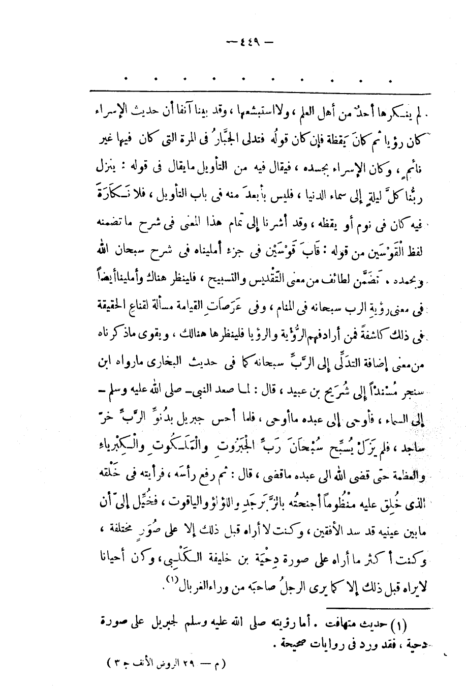 لَمْ يُنْكِرْهَا أَحَدٌ مِنْ أَهْلِ الْعِلْمِ، وَلَا اسْتَبْشَعَهَا، وَقَدْ بَيّنّا آنِفًا أَنّ حَدِيثَ الْإِسْرَاءِ كَانَ رُؤْيَا ثُمّ كَانَ يَقَظَةً فَإِنْ كَانَ قَوْلُهُ فَتَدَلّى الْجَبّارُ فِي الْمَرّةِ الّتِي كَانَ فِيهَا غَيْرَ نَائِمٍ، وَكَانَ الْإِسْرَاءُ بِجَسَدِهِ، فَيُقَالُ فِيهِ مِنْ التّأْوِيلِ مَا يُقَالُ فِي قَوْلِهِ: يَنْزِلُ رَبّنَا كُلّ لَيْلَةٍ إلَى سَمَاءِ الدّنْيَا، فَلَيْسَ بِأَبْعَدَ مِنْهُ فِي بَابِ التّأْوِيلِ، فَلَا نَكَارَةَ فِيهِ كَانَ فِي نَوْمٍ أَوْ يَقَظَةٍ، وَقَدْ أَشَرْنَا إلَى تَمَامِ هَذَا الْمَعْنَى فِي شَرْحِ مَا تَضَمّنَهُ لَفْظُ الْقَوْسَيْنِ مِنْ قَوْلِهِ: قَابَ قَوْسَيْنِ فِي جُزْءٍ أَمْلَيْنَاهُ فِي شَرْحِ سُبْحَانَ اللهِ وَبِحَمْدِهِ، تَضَمّنَ لَطَائِفَ مِنْ مَعْنَى التّقْدِيسِ وَالتّسْبِيحِ، فَلْيُنْظَرْ هُنَاكَ وَأَمْلَيْنَا أَيْضًا فِي مَعْنَى رُؤْيَةِ الرّبّ سُبْحَانَهُ فِي الْمَنَامِ، وَفِي عَرَصَاتِ الْقِيَامَةِ مَسْأَلَةً لِقِنَاعِ الْحَقِيقَةِ فِي ذَلِكَ كَاشِفَةً فَمَنْ أَرَادَ فَهْمَ الرّؤْيَةِ وَالرّؤْيَا فَلْيَنْظُرْهَا هُنَالِكَ، وَيُقَوّي مَا ذَكَرْنَاهُ مِنْ مَعْنَى إضَافَةِ التّدَلّي إلَى الرّبّ سُبْحَانَهُ كَمَا فِي حَدِيثِ الْبُخَارِيّ مَا رَوَاهُ ابْنُ سُنْجُرَ مُسْنَدًا إلَى شُرَيْحِ بْنِ عُبَيْدٍ، قَالَ: لَمّا صَعِدَ النّبِيّ- صَلَّى اللَّهُ عَلَيْهِ وَسَلَّمَ- إلَى السّمَاءِ، فَأَوْحَى إلَى عَبْدِهِ مَا أَوْحَى، فَلَمّا أَحَسّ جِبْرِيلُ بدنوّ الرّبّ خرّ ساجد، فَلَمْ يَزَلْ يُسَبّحُ سُبْحَانَ رَبّ الْجَبَرُوتِ وَالْمَلَكُوتِ وَالْكِبْرِيَاءِ وَالْعَظَمَةِ حَتّى قَضَى اللهُ إلَى عَبْدِهِ مَا قَضَى، قَالَ: ثُمّ رَفَعَ رَأْسَهُ، فَرَأَيْته فِي خَلْقِهِ الّذِي خُلِقَ عَلَيْهِ مَنْظُومًا أَجْنِحَتُهُ بِالزّبَرْجَدِ وَاللّؤْلُؤِ وَالْيَاقُوتِ، فَخُيّلَ إلَيّ أَنّ مَا بَيْنَ عَيْنَيْهِ قَدْ سَدّ الْأُفُقَيْنِ، وَكُنْت لَا أَرَاهُ قَبْلَ ذَلِكَ إلّا عَلَى صُوَرٍ مُخْتَلِفَةٍ، وَكُنْت أَكْثَرَ مَا أَرَاهُ عَلَى صُورَةِ دِحْيَةَ بْنِ خَلِيفَةَ الْكَلْبِيّ، وَكَانَ أَحْيَانًا لَا يَرَاهُ قَبْلَ ذَلِكَ إلّا كَمَا يَرَى الرّجُلُ صَاحِبَهُ من وراء الغربال «1» .
