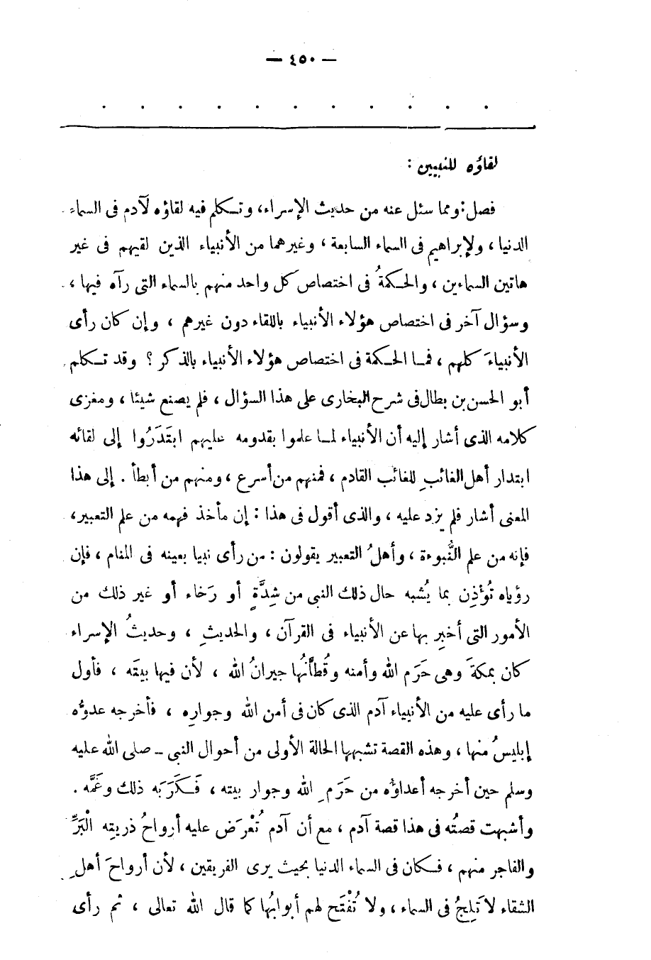 وَسُؤَالٌ آخَرُ فِي اخْتِصَاصِ هَؤُلَاءِ الْأَنْبِيَاءِ بِاللّقَاءِ دُونَ غَيْرِهِمْ، وَإِنْ كَانَ رَأَى الْأَنْبِيَاءَ كُلّهُمْ، فَمَا الْحِكْمَةُ فِي اخْتِصَاصِ هَؤُلَاءِ الْأَنْبِيَاءِ بِالذّكْرِ؟ وَقَدْ تَكَلّمَ أَبُو الْحَسَنِ بْنُ بَطّالٍ فِي شَرْحِ الْبُخَارِيّ عَلَى هَذَا السّؤَالِ، فَلَمْ يَصْنَعْ شَيْئًا، وَمَغْزَى كَلَامِهِ الّذِي أَشَارَ إلَيْهِ أَنّ الْأَنْبِيَاءَ لَمّا عَلِمُوا بِقُدُومِهِ عَلَيْهِمْ ابْتَدَرُوا إلَى لِقَائِهِ ابْتِدَارَ أَهْلِ الْغَائِبِ لِلْغَائِبِ الْقَادِمِ، فَمِنْهُمْ مَنْ أَسْرَعَ، وَمِنْهُمْ مَنْ أَبْطَأَ. إلَى هَذَا الْمَعْنَى أَشَارَ فَلَمْ يَزِدْ عَلَيْهِ، وَاَلّذِي أَقُولُ فِي هَذَا: إنّ مَأْخَذَ فَهْمِهِ مِنْ عِلْمِ التّعْبِيرِ، فَإِنّهُ مِنْ عِلْمِ النّبُوءَةِ، وَأَهْلُ التّعْبِيرِ يَقُولُونَ: مَنْ رَأَى نَبِيّا بِعَيْنِهِ فِي الْمَنَامِ، فَإِنّ رُؤْيَاهُ تُؤْذِنُ بِمَا يُشْبِهُ حَالَ ذَلِكَ النّبِيّ مِنْ شِدّةٍ أَوْ رَخَاءٍ أَوْ غَيْرِ ذَلِكَ مِنْ الْأُمُورِ الّتِي أُخْبِرَ بِهَا عَنْ الْأَنْبِيَاءِ فِي الْقُرْآنِ، وَالْحَدِيثِ، وَحَدِيثُ الْإِسْرَاءِ كَانَ بِمَكّةَ وَهِيَ حَرَمُ اللهِ وَأَمْنُهُ وَقُطّانُهَا جِيرَانُ اللهِ، لِأَنّ فِيهَا بَيْتَهُ، فَأَوّلُ مَا رَأَى عَلَيْهِ مِنْ الْأَنْبِيَاءِ آدَمُ الّذِي كَانَ فِي أَمْنِ اللهِ وَجِوَارِهِ، فَأَخْرَجَهُ عَدُوّهُ إبْلِيسُ مِنْهَا، وَهَذِهِ الْقِصّةُ تُشْبِهُهَا الْحَالَةُ الْأُولَى مِنْ أَحْوَالِ النّبِيّ- صَلَّى اللَّهُ عَلَيْهِ وَسَلَّمَ حِينَ أَخْرَجَهُ أَعْدَاؤُهُ مِنْ حَرَمِ اللهِ وَجِوَارِ بَيْتِهِ، فَكَرَبَهُ ذَلِكَ وَغَمّهُ.