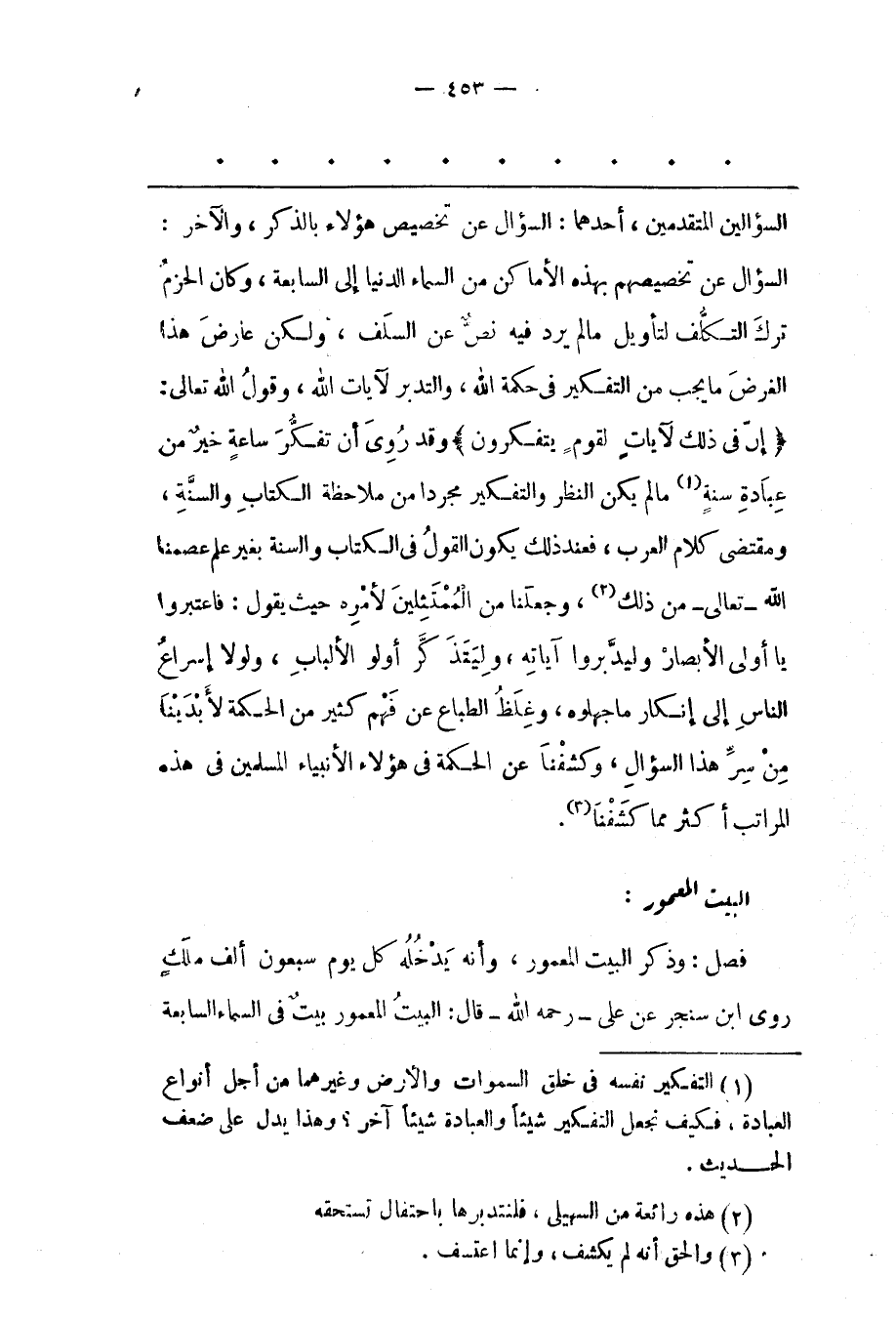 السّؤَالُ عَنْ تَخْصِيصِهِمْ بِهَذِهِ الْأَمَاكِنِ مِنْ السّمَاءِ الدّنْيَا إلَى السّابِعَةِ، وَكَانَ الْحَزْمُ تَرْكَ التّكَلّفِ لِتَأْوِيلِ مَا لَمْ يَرِدْ فِيهِ نَصّ عَنْ السّلَفِ، وَلَكِنْ عَارَضَ هَذَا الْغَرَضُ مَا يَجِبُ مِنْ التّفْكِيرِ فِي حِكْمَةِ اللهِ، وَالتّدَبّرِ لِآيَاتِ اللهِ، وَقَوْلُ اللهِ تَعَالَى: