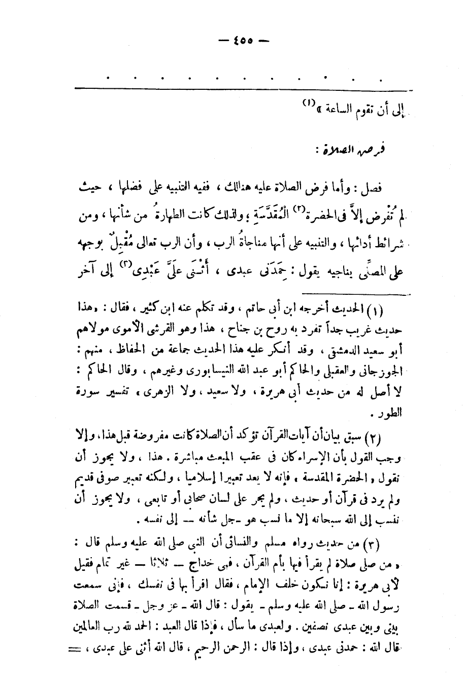 (2) سبق بيان أن آيات القرآن تؤكد أن الصلاة كانت مفروضة قبل هذا، وإلا وجب القول بأن الإسراء كان فى عقب المبعث مباشرة. هذا، ولا يجوز أن نقول «الحضرة المقدسة» فإنه لا يعد تعبيرا إسلاميا، ولكنه تعبير صوفى قديم ولم يرد فى قرآن أو حديث، ولم يجر على لسان صحابى أو تابعى، ولا يجوز أن تنسب إلى الله سبحانه إلا ما نسب هو- جل شأنه- إلى نفسه.