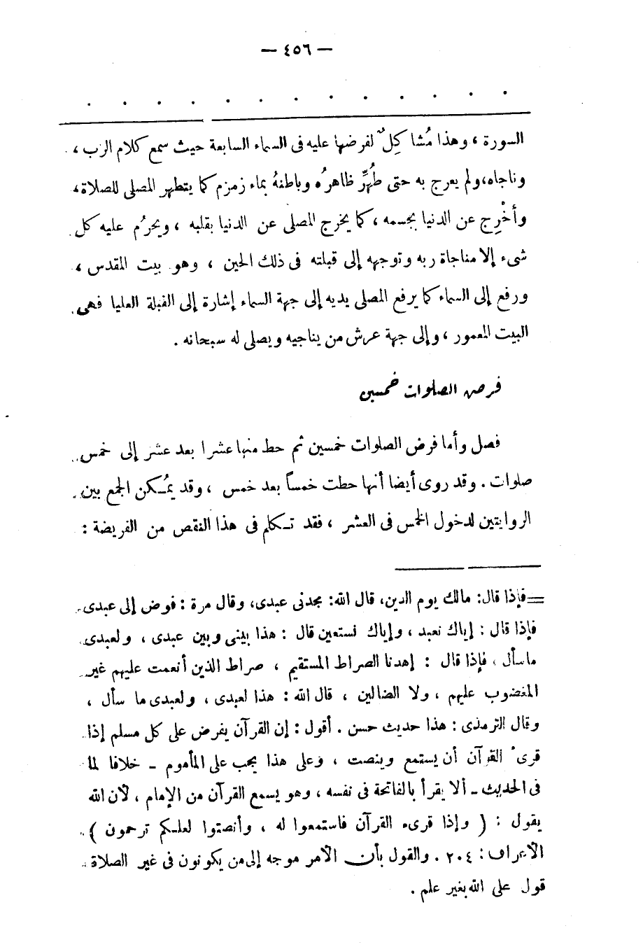 فَرْضُ الصّلَوَاتِ خَمْسِينَ فَصْلٌ وَأَمّا فَرْضُ الصّلَوَاتِ خَمْسِينَ ثُمّ حَطّ مِنْهَا عَشْرًا بَعْدَ عَشْرٍ إلَى خَمْسِ صَلَوَاتٍ. وَقَدْ رُوِيَ أَيْضًا أَنّهَا حُطّتْ خَمْسًا بَعْدَ خَمْسٍ، وَقَدْ يُمْكِنُ الْجَمْعُ بَيْنَ الرّوَايَتَيْنِ لِدُخُولِ الْخَمْسِ فِي الْعَشْرِ، فَقَدْ تكلم فى هذا النقص من الفريضة: