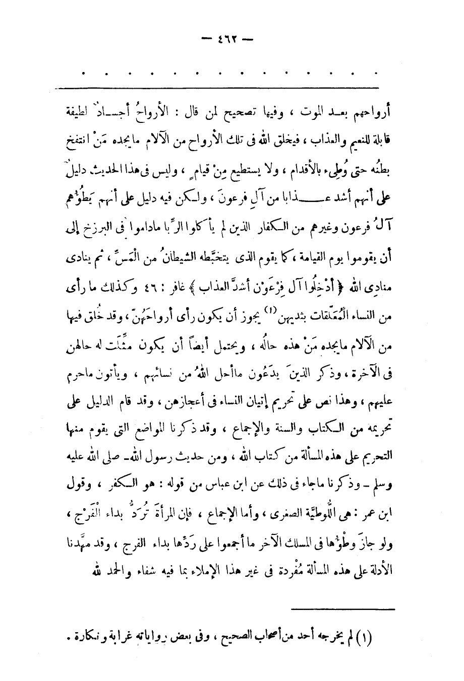 أَرْوَاحِهِمْ بَعْدَ الْمَوْتِ، وَفِيهَا تَصْحِيحٌ لِمَنْ قَالَ: الْأَرْوَاحُ أَجْسَادٌ لَطِيفَةٌ قَابِلَةٌ لِلنّعِيمِ وَالْعَذَابِ، فَيَخْلُقُ اللهُ فِي تِلْكَ الْأَرْوَاحِ مِنْ الْآلَامِ مَا يجده من انتفخ بطنه حتى وطىء بِالْأَقْدَامِ، وَلَا يَسْتَطِيعُ مِنْ قِيَامٍ، وَلَيْسَ فِي هَذَا الْحَدِيثِ دَلِيلٌ عَلَى أَنّهُمْ أَشَدّ عَذَابًا مِنْ آلِ فِرْعَوْنَ، وَلَكِنْ فِيهِ دَلِيلٌ عَلَى أَنّهُمْ يَطَؤُهُمْ آلُ فِرْعَوْنَ وَغَيْرُهُمْ مِنْ الْكُفّارِ الّذِينَ لَمْ يَأْكُلُوا الرّبَا مَا دَامُوا فِي الْبَرْزَخِ إلَى أَنْ يَقُومُوا يَوْمَ الْقِيَامَةِ، كَمَا يَقُومُ الّذِي يَتَخَبّطُهُ الشّيْطَانُ مِنْ الْمَسّ، ثُمّ يُنَادِي مُنَادِي اللهِ أَدْخِلُوا آلَ فِرْعَوْنَ أَشَدَّ الْعَذابِ غَافِرَ: 46 وَكَذَلِكَ مَا رَأَى مِنْ النّسَاءِ الْمُعَلّقَاتِ بِثُدِيّهِنّ «1» يَجُوزُ أَنْ يَكُونَ رَأَى أَرْوَاحَهُنّ، وَقَدْ خُلِقَ فِيهَا مِنْ الْآلَامِ مَا يَجِدُهُ مَنْ هَذِهِ حَالُهُ، وَيَحْتَمِلُ أَيْضًا أَنْ يَكُونَ مُثّلَتْ لَهُ حَالُهُنّ فِي الْآخِرَةِ، وَذَكَرَ الّذِينَ يَدْعُونَ مَا أَحَلّ اللهُ مِنْ نِسَائِهِمْ، وَيَأْتُونَ مَا حُرّمَ عَلَيْهِمْ، وَهَذَا نَصّ عَلَى تَحْرِيمِ إتْيَانِ النّسَاءِ فِي أَعْجَازِهِنّ، وَقَدْ قَامَ الدّلِيلُ عَلَى تَحْرِيمِهِ مِنْ الْكِتَابِ وَالسّنّةِ وَالْإِجْمَاعِ، وَقَدْ ذَكَرْنَا الْمَوَاضِعَ الّتِي يَقُومُ مِنْهَا التّحْرِيمُ عَلَى هَذِهِ الْمَسْأَلَةِ مِنْ كِتَابِ اللهِ، وَمِنْ حَدِيثِ رَسُولِ اللهِ- صَلَّى اللَّهُ عَلَيْهِ وَسَلَّمَ- وَذَكَرْنَا مَا جَاءَ فِي ذَلِكَ عَنْ ابْنِ عَبّاسٍ مِنْ قَوْلِهِ: هُوَ الْكُفْرُ، وَقَوْلُ ابْنِ عُمَرَ: هى الّلوطيّة الصغرى، وأما الْإِجْمَاعُ، فَإِنّ الْمَرْأَةَ تُرَدّ بِدَاءِ الْفَرْجِ، وَلَوْ جَازَ وَطْؤُهَا فِي الْمَسْلَكِ الْآخَرِ مَا أَجْمَعُوا عَلَى رَدّهَا بِدَاءِ الْفَرْجِ، وَقَدْ مَهّدْنَا الْأَدِلّةَ عَلَى هَذِهِ الْمَسْأَلَةِ مُفْرَدَةً فِي غَيْرِ هَذَا الإملاء بما فيه شفاء والحمد لله