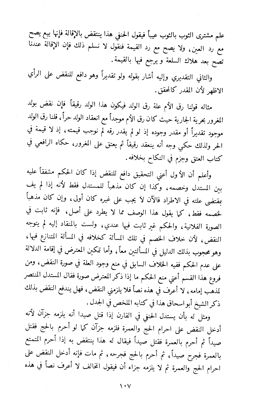 علم مشتري الثوب بالثوب عيبا فيقول الحنفي هذا ينتقض بالإقالة فإنها بيع يصح مع رد العين ولا يصح مع رد القيمة فنقول لا نسلم ذلك فإن الإقالة عندنا تصح بعد هلاك السلعة ويرجع فيها بالقيمة