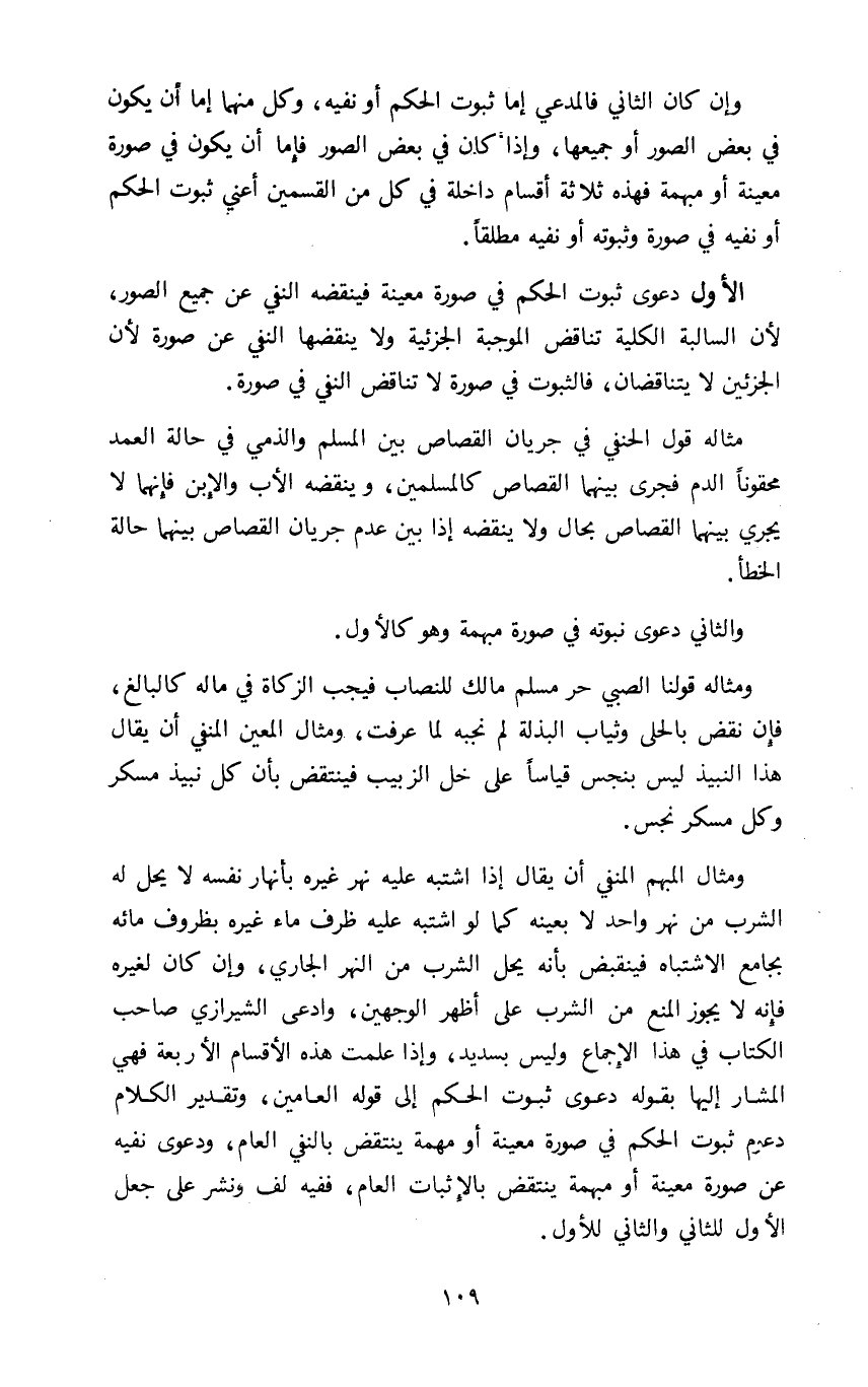 وإن كان الثاني فالمدعي إما ثبوت الحكم أو نفيه وكل منهما إما أن يكون في بعض الصور أو جميعها وإذا كان في بعض الصور فإما أن يكون في صورة معينة أو مبهمة فهذه ثلاثة أقسام داخلة في كل من القسمين أعني ثبوت الحكم أو نفيه في صورة وثبوته أو نفيه مطلقا