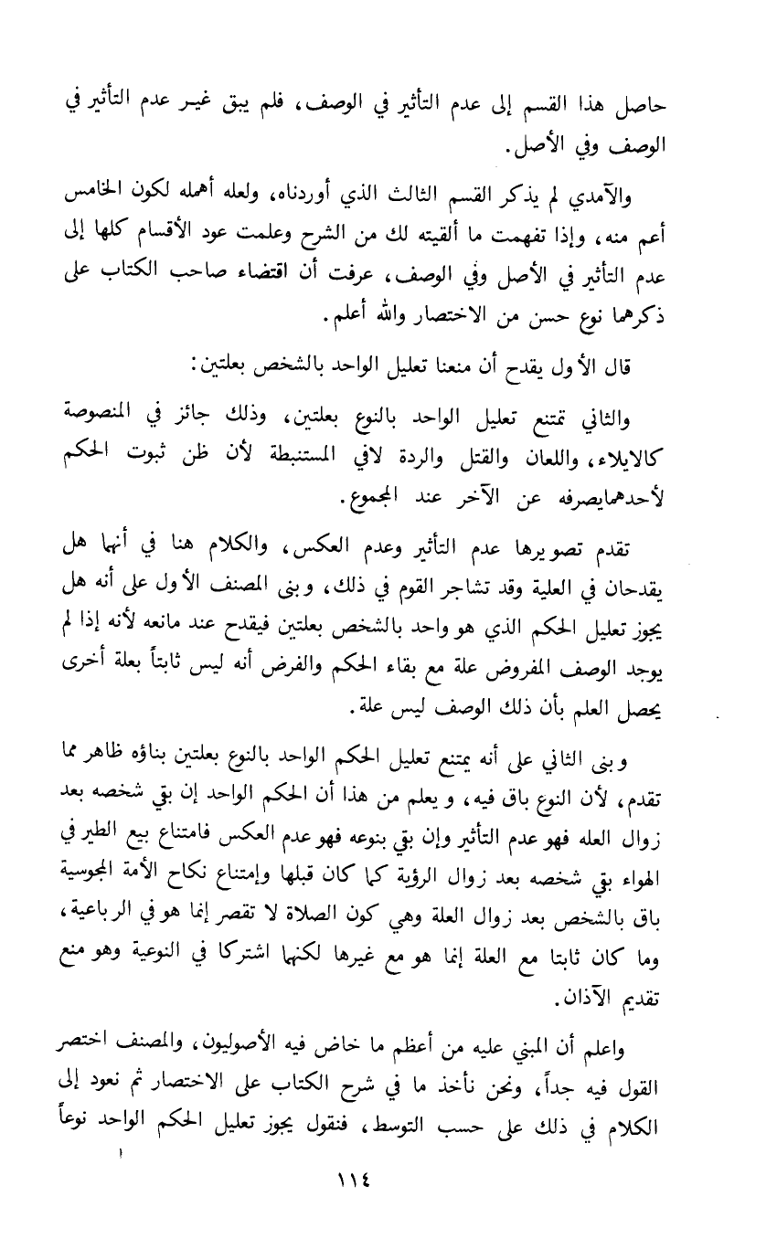 وبنى الثاني على أنه يمتنع تعليل الحكم الواحد بالنوع بعلتين بناؤه ظاهر مما تقدم لأن النوع باق فيه ويعلم من هذا أن الحكم الواحد إن بقي شخصه بعد زوال العلة فهو عدم التأثير وإن بقي بنوعه فهو عدم العكس فامتناع بيع الطير في الهواء بقي شخصه بعد زوال الرؤية كما كان قبلها وامتناع نكاح الأمة المجوسية باق بالشخص بعد زوال العلة وهي كون الصلاة لا تقصر إنما هو في الرباعية وما كان ثابتا مع العلة إنما هو مع غيرها لكنهما اشتركا في النوعية وهو منع تقديم الآذان