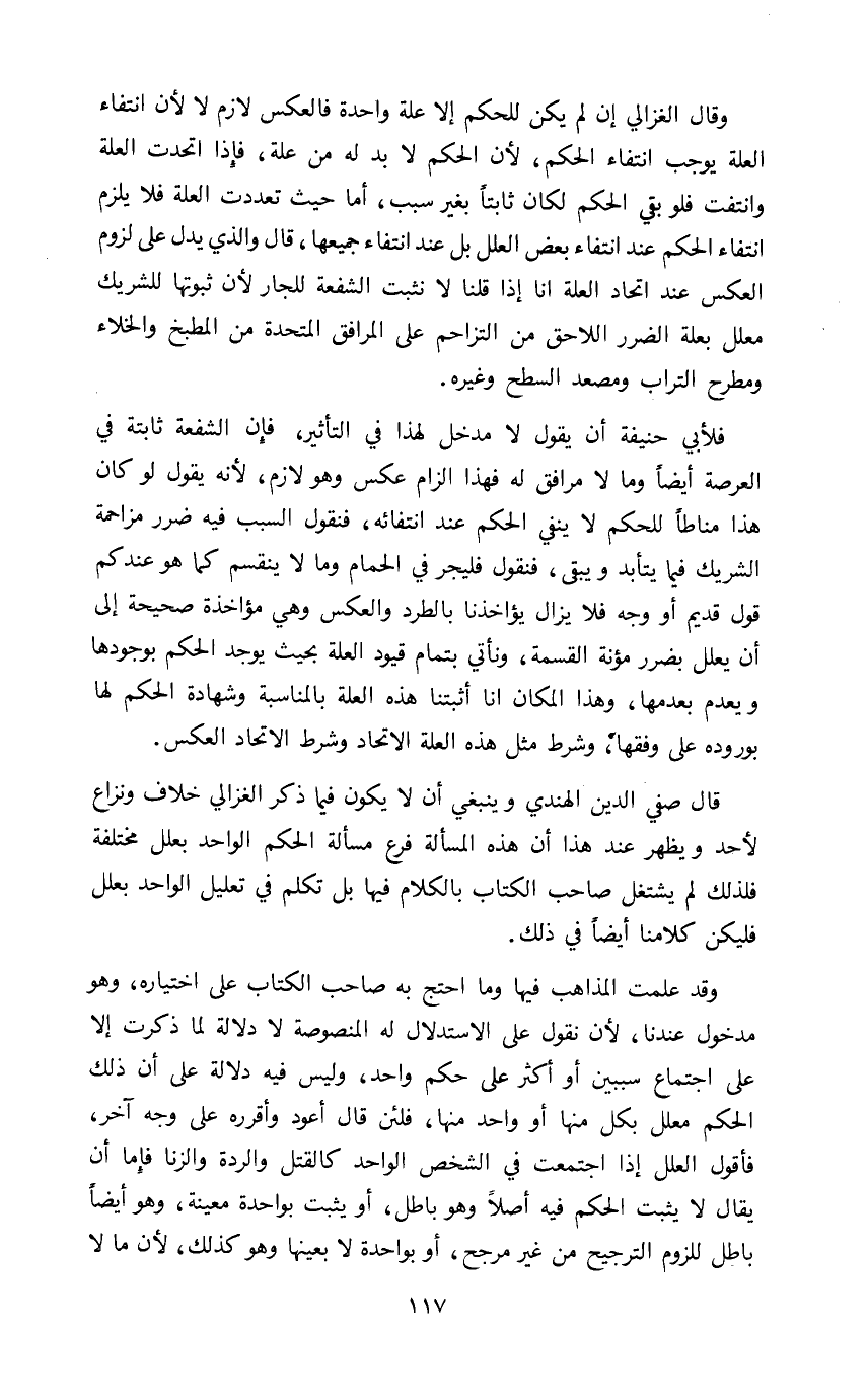 وقال الغزالي إن لم يكن للحكم إلا علة واحدة فالعكس لازم لأن انتفاء العلة يوجب انتفاء الحكم لأن الحكم لا بد له من علة فإذا اتحدت العلة وانتفت فلو بقي الحكم لكان ثابتا بغير سبب أما حيث تعددت العلة فلا يلزم انتفاء الحكم عند انتفاء بعض العلل بل عند انتفاء جميعها قال والذي يدل على لزوم العكس عند اتحاد العلة أنا إذا قلنا لا نثبت الشفعة للجار لأن ثبوتها للشريك معلل بعلة الضرر اللاحق من التزاحم على المرافق المتحدة من المطبخ والخلاء ومطرح التراب ومصعد السطح وغيره