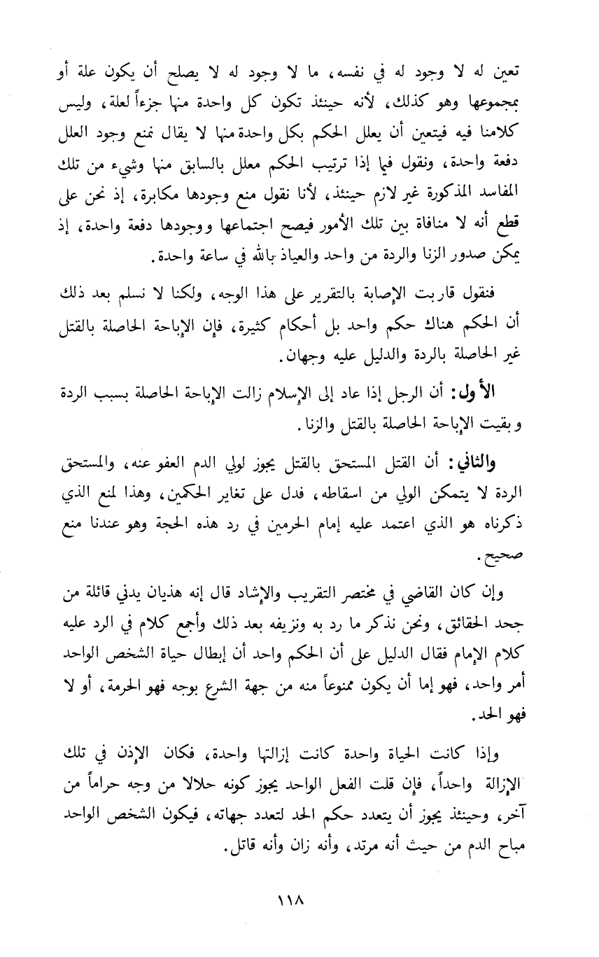 وإن كان القاضي في مختصر التقريب والإشاد قال إنه هذيان يدني قائله من جحد الحقائق ونحن نذكر ما رد به ونزيفه بعد ذلك وأجمع كلام في الرد عليه كلام الإمام فقال الدليل على أن الحكم واحد أن إبطال حياة الشخص الواحد أمر واحد فهو إما أن يكون ممنوعا منه من جهة الشرع بوجه فهو الحرمة أو لا فهو الحد